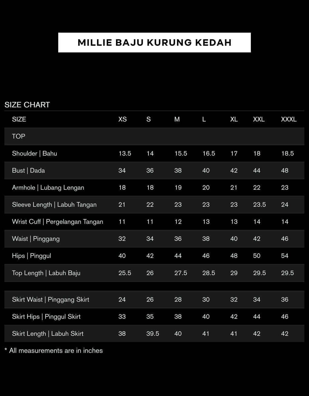 | Skirt Length | Labuh Skirt | 38 | 39.5 | 40 | 41 | 41 | 42 | 42 |