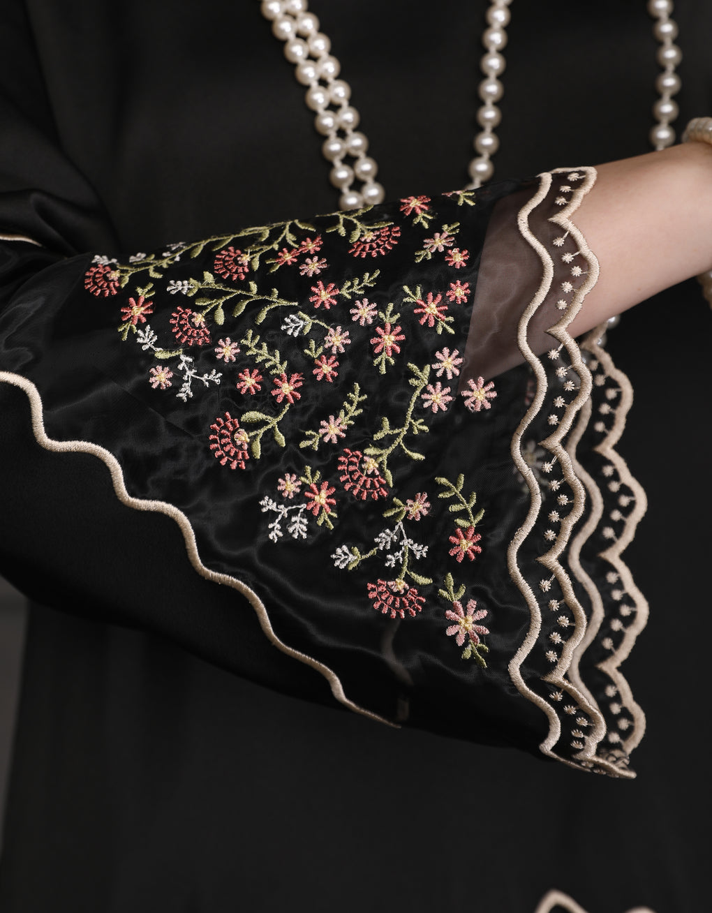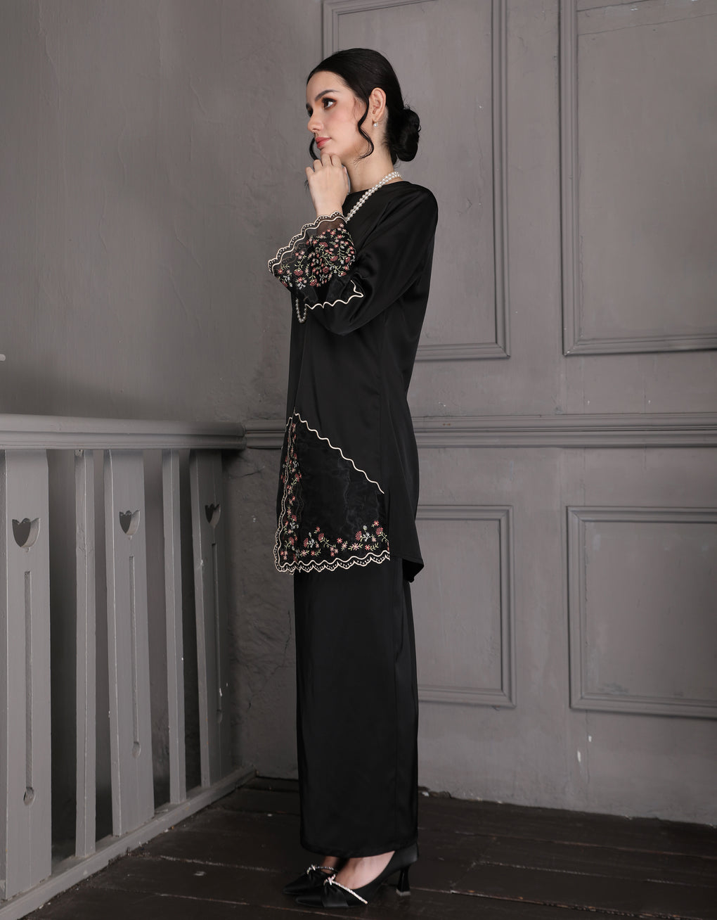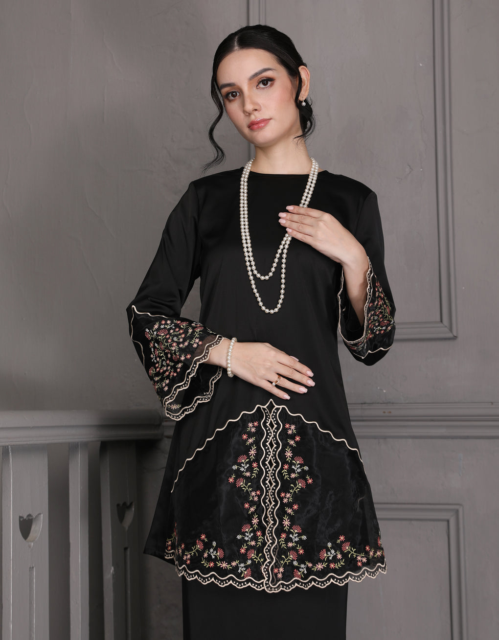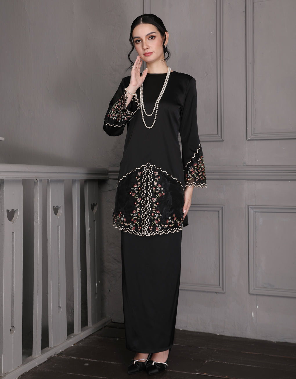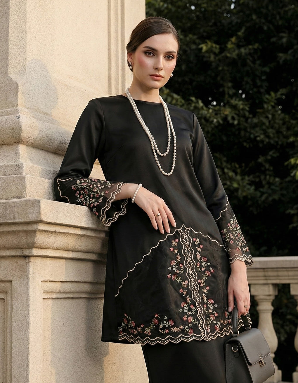 'Baju Kurung Pahang Moden Aurelia' blends tradition with a modern touch. Made from premium Italian Silky Satin, this piece features delicate embroidery on soft organdy that enhances its refined look. It offers both elegance and comfort in a long, flattering silhouette. A timeless choice for formal events or refined everyday wear.