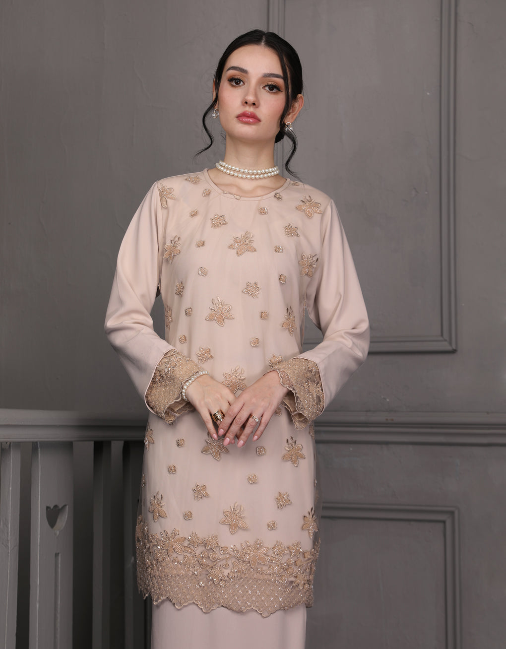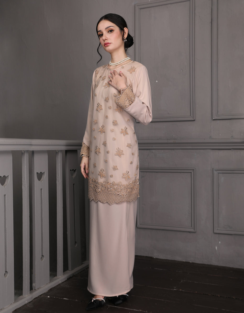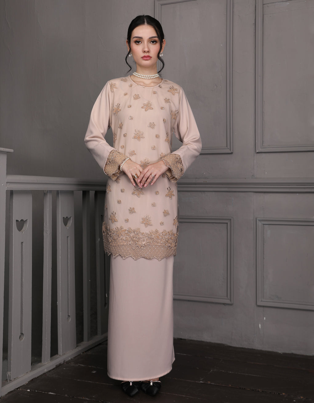 Baju Kurung Moden Rowena Luxurious and exclusive beaded lace delicately sewn for a rich and stunning look. The interlining are made of soft hand-feel jojo crepe fabric.