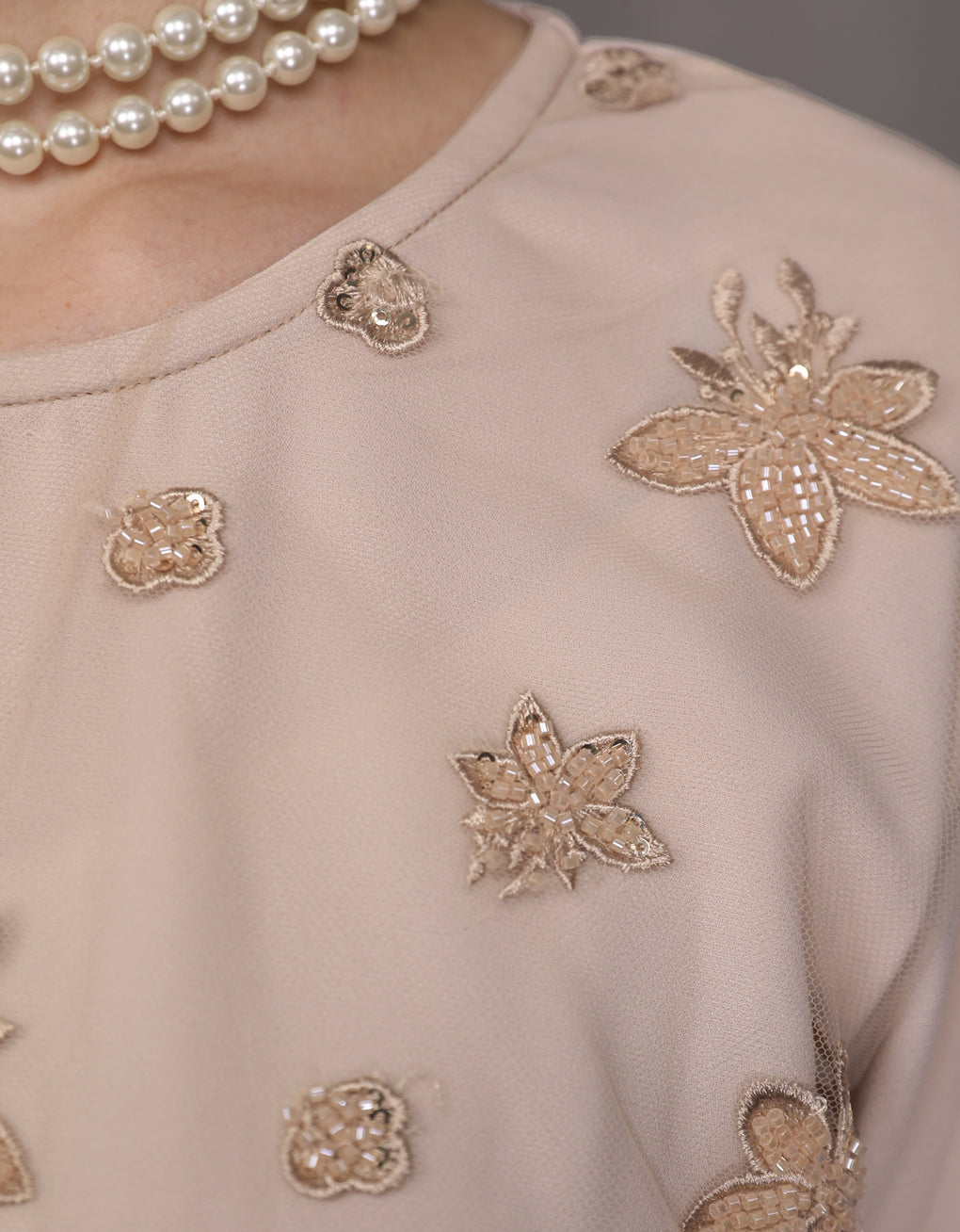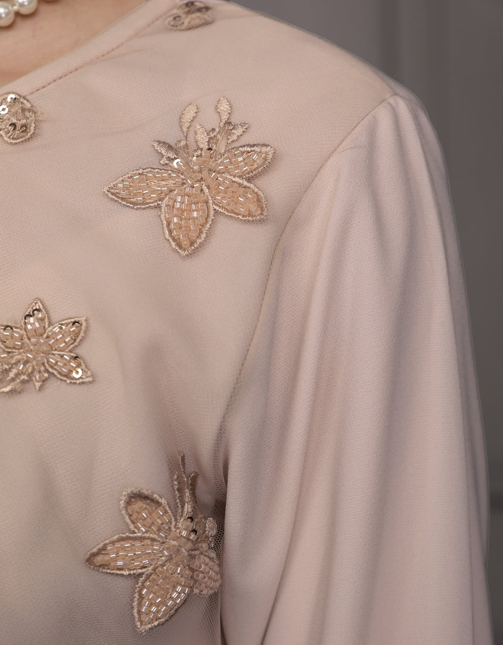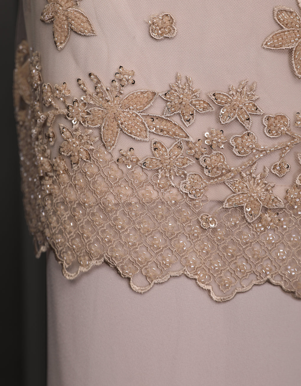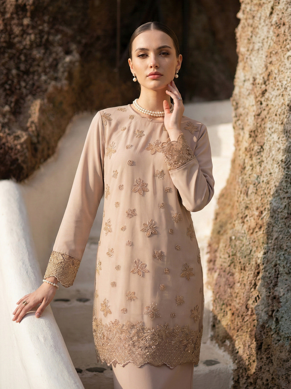 Baju Kurung Moden Rowena Luxurious and exclusive beaded lace delicately sewn for a rich and stunning look. The interlining are made of soft hand-feel jojo crepe fabric.