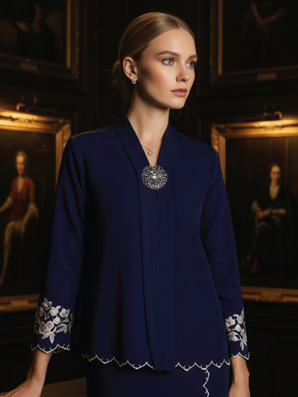 Crafted from premium Italian crepe and featuring intricate embroidery, this baju kebaya offers a form fitting silhouette with a slight stretch for comfort. Its soft touch to the skin makes it breathable and luxurious.