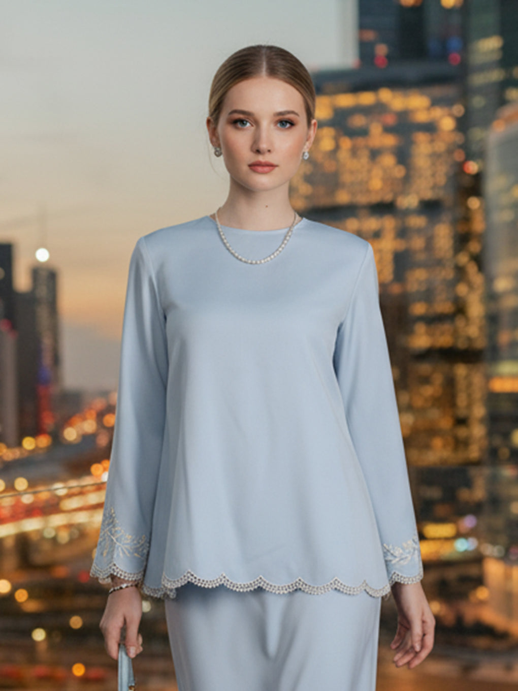 The Soft Stretch Twill fabric used in the creation of the Baju Kurung Kedah with intricate embroidery, seamlessly combines attributes such as a slight stretch for optimal fit, breathable qualities, and a luxurious softness against the skin.