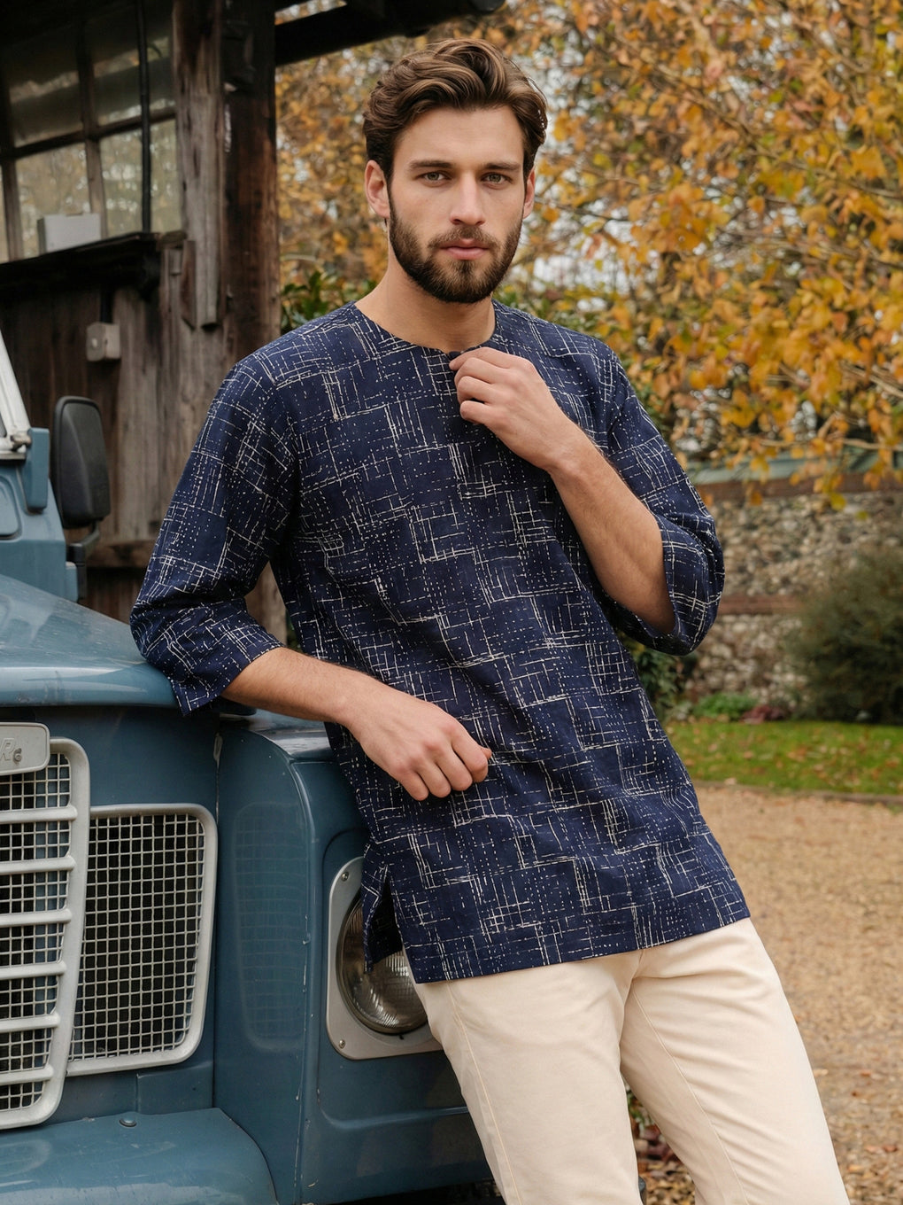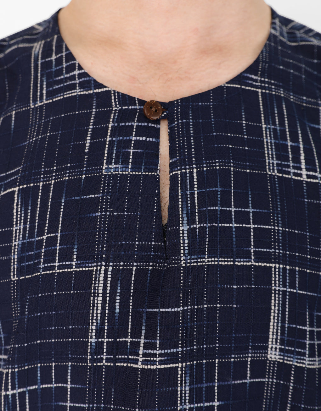Crafted from premium cotton slub, this round-neck kurta delivers breathable comfort for everyday wear. The three-quarter sleeves offer ease of movement, while strategically placed side pockets enhance wearability without disrupting the clean silhouette. Ideal for layering or wearing solo, it adapts effortlessly from casual daywear to more polished settings, making it a dependable wardrobe staple for those who value both comfort and refined aesthetics.