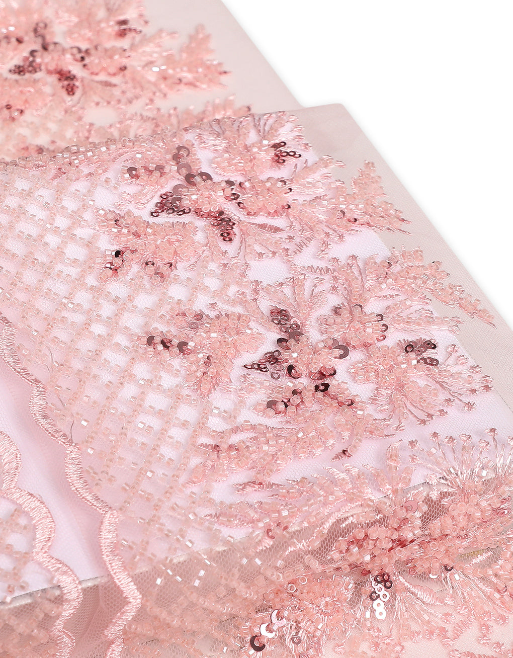 Beaded Border lace  is a fine fabrics that comes in floral and abstract pattern and also with minimalist sequins and beads. Giving the highest recognition for the exquisite vibe of femininity to the wearer. It also has a good drapability.