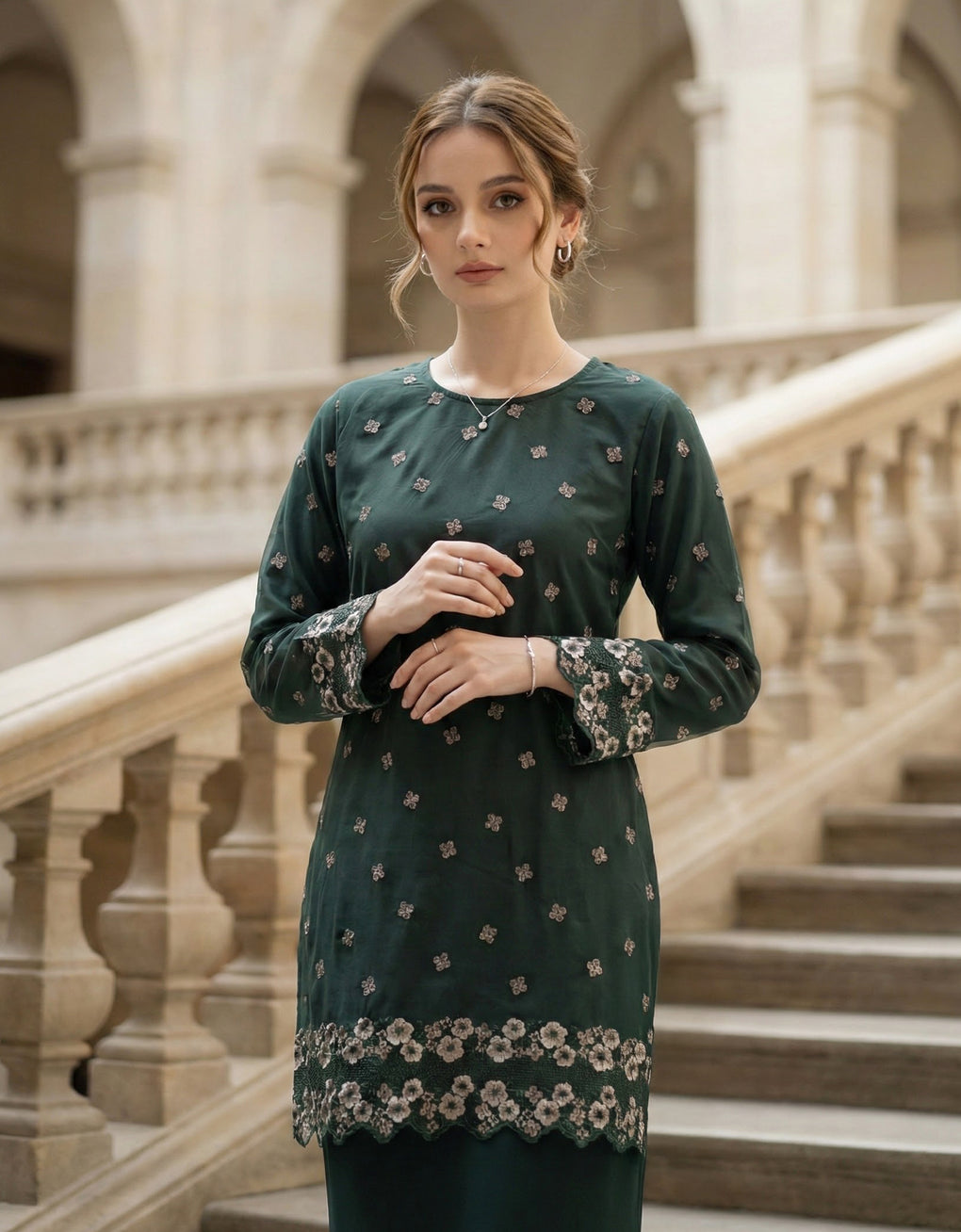 Crafted in a timeless Moden cut, this piece offers a comfortable fit. Delicate floral embroidered lace and a subtly geometric hem create a graceful blend of femininity and elegance perfect for any occasion.