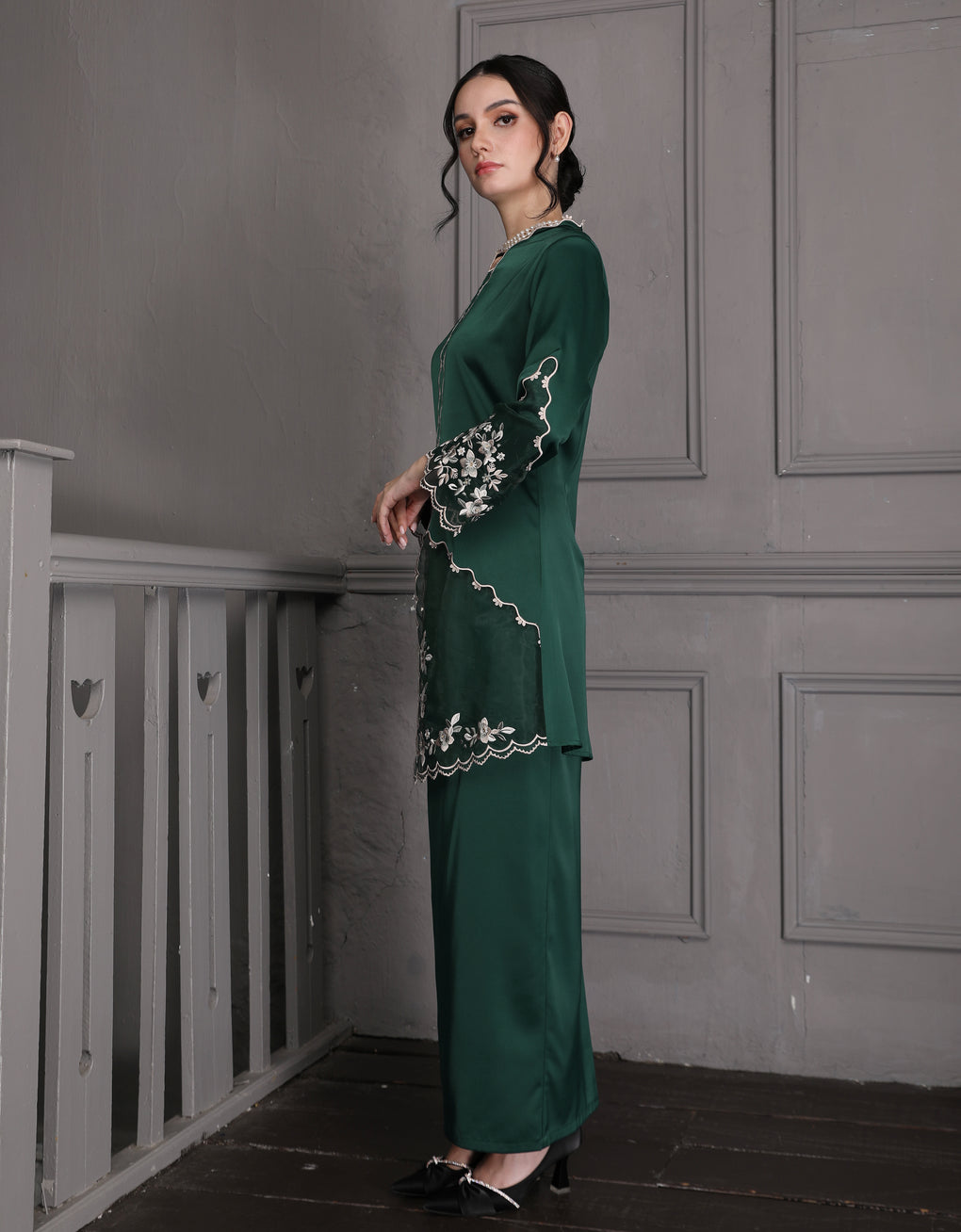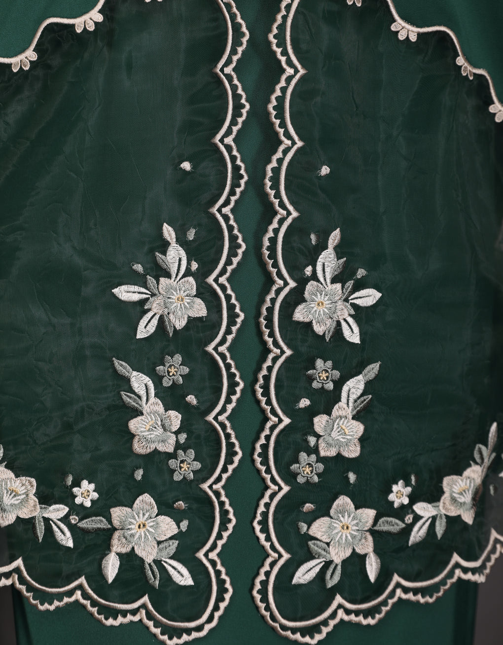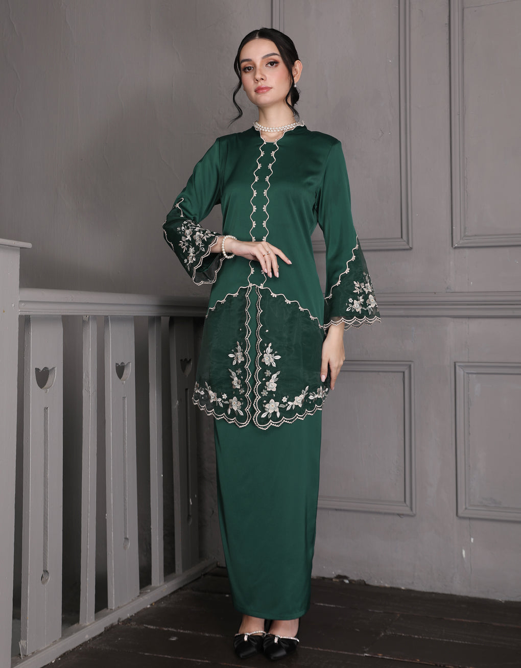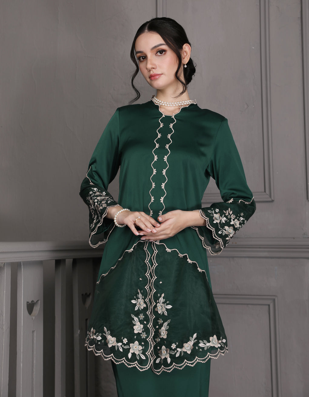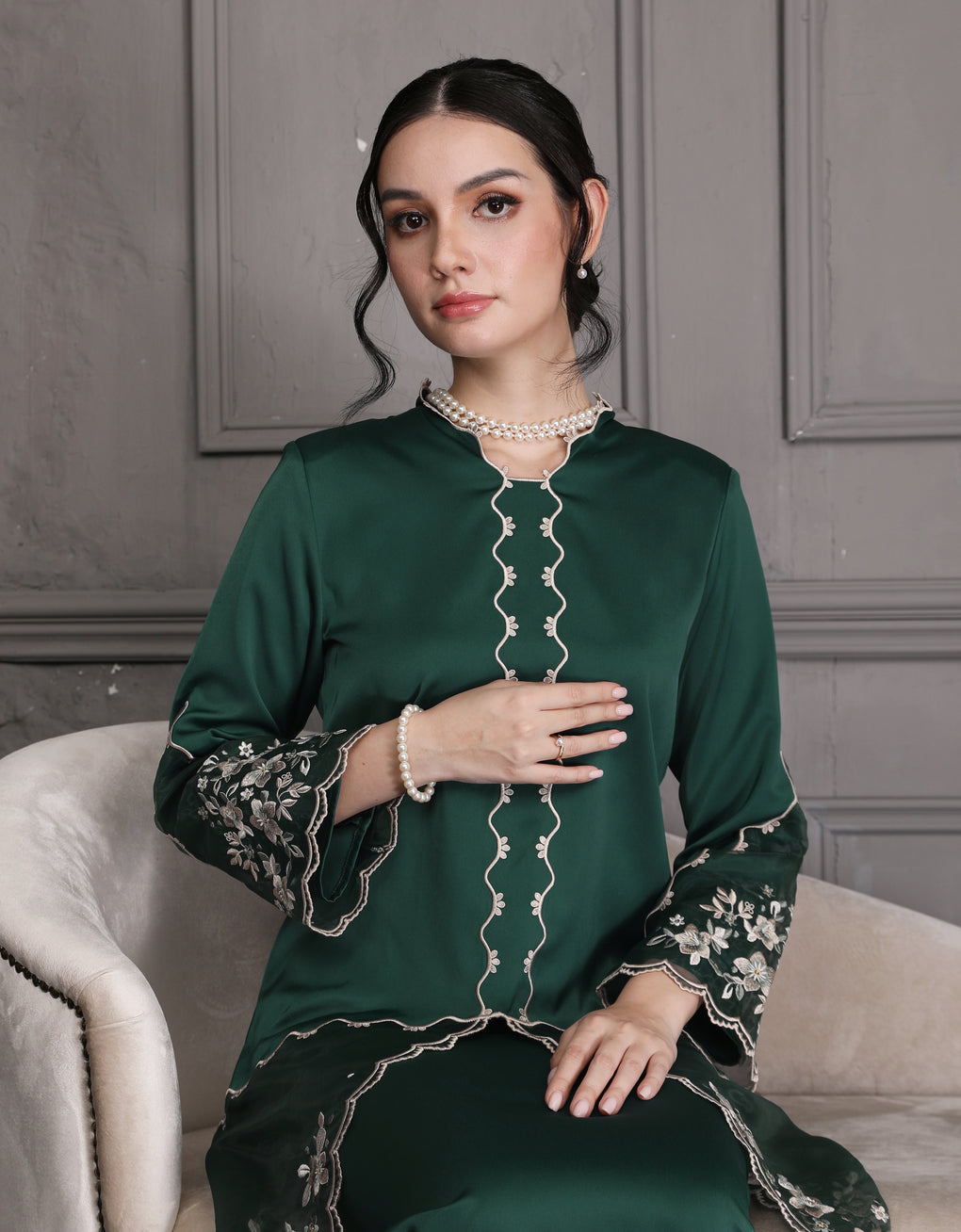 The 'Baju Kebaya Moden Lizy' is crafted from Italian Silky Satin with a scalloped neckline and detailed Embroidered Organza on the sleeves and hem. Elegant and refined—perfect for festive or formal occasions.