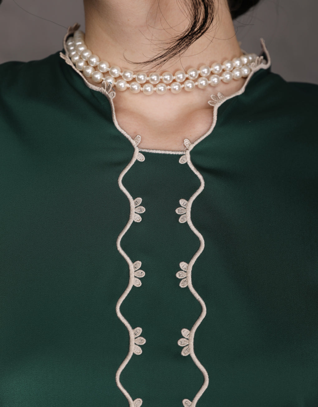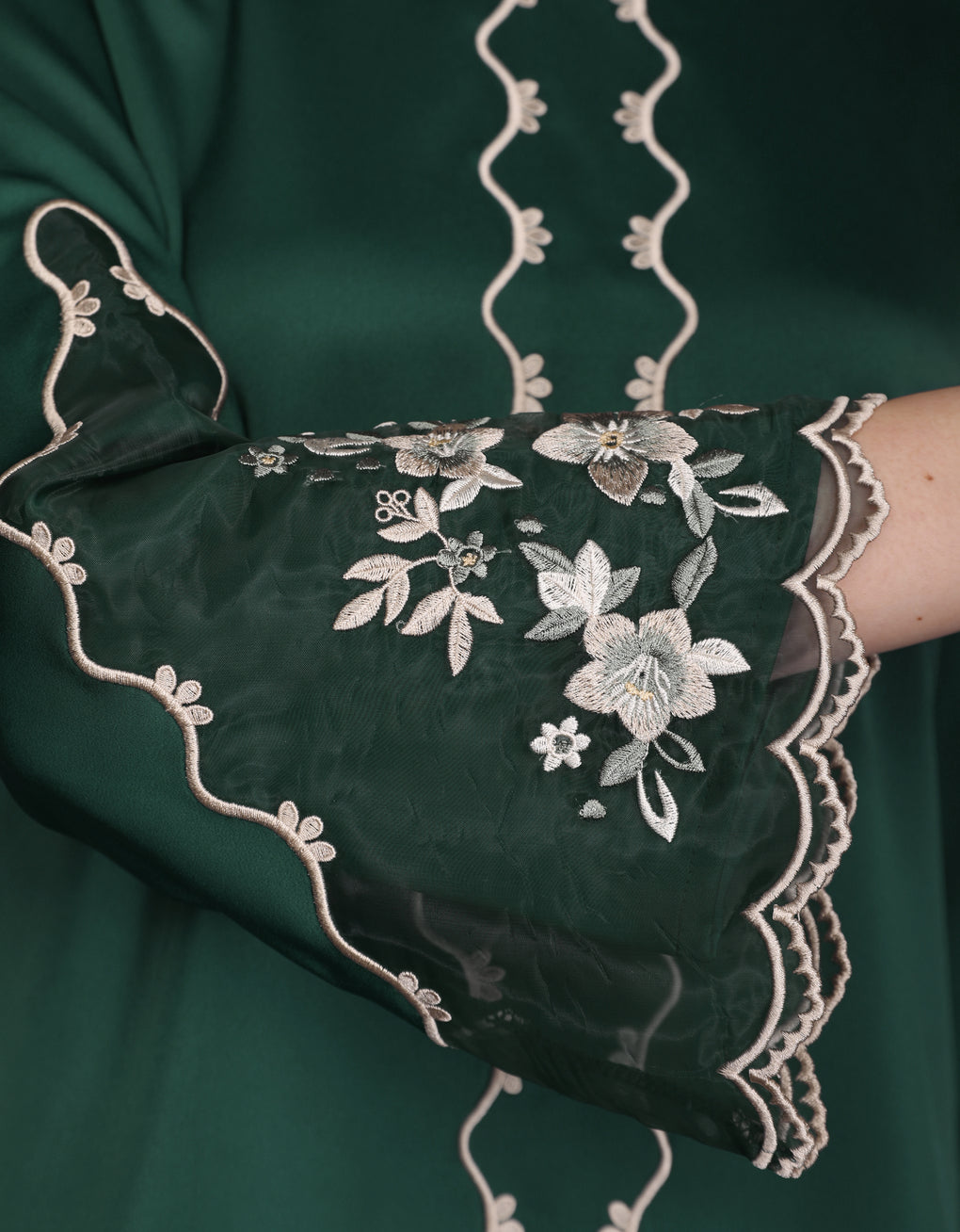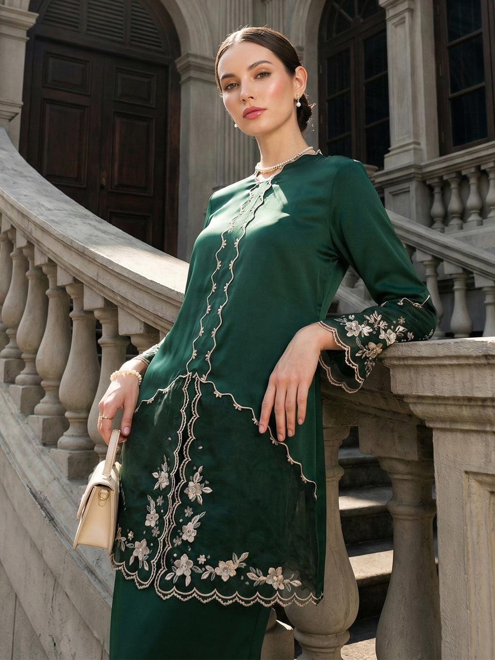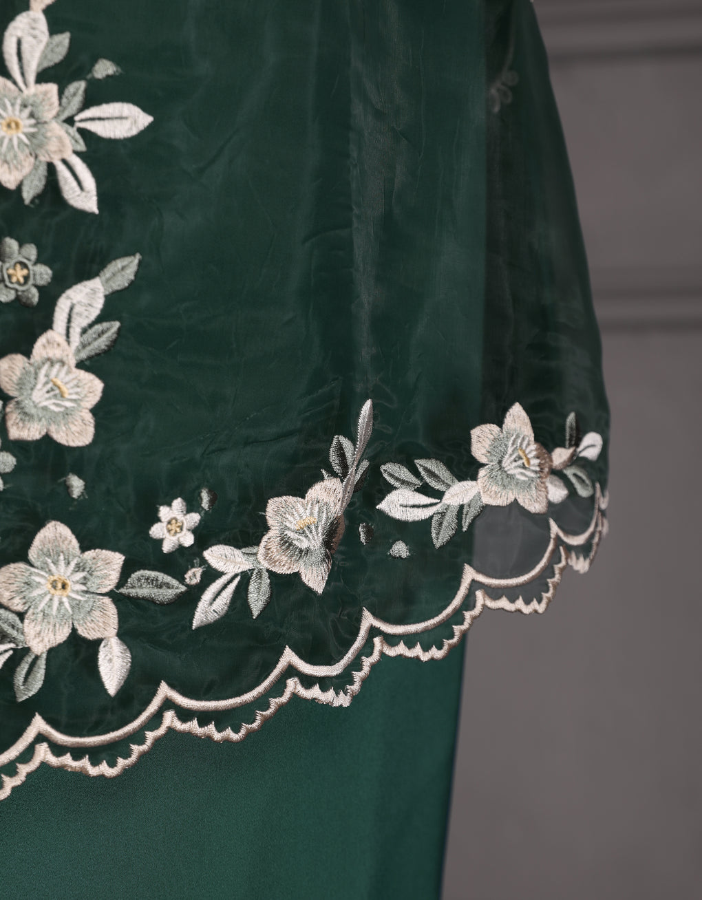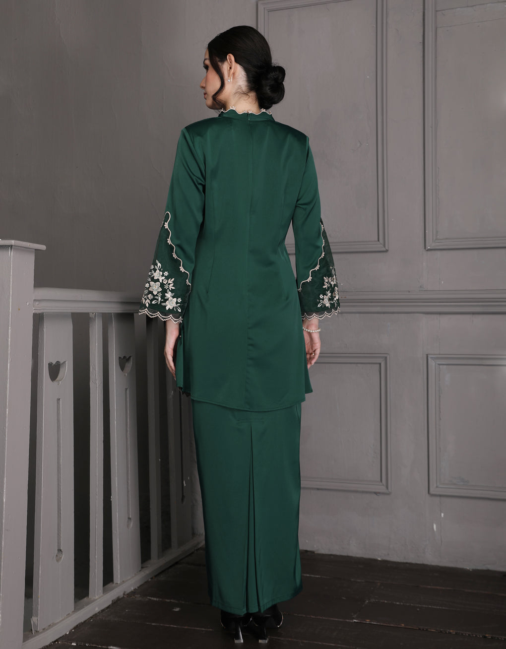 The 'Baju Kebaya Moden Lizy' is crafted from Italian Silky Satin with a scalloped neckline and detailed Embroidered Organza on the sleeves and hem. Elegant and refined—perfect for festive or formal occasions.