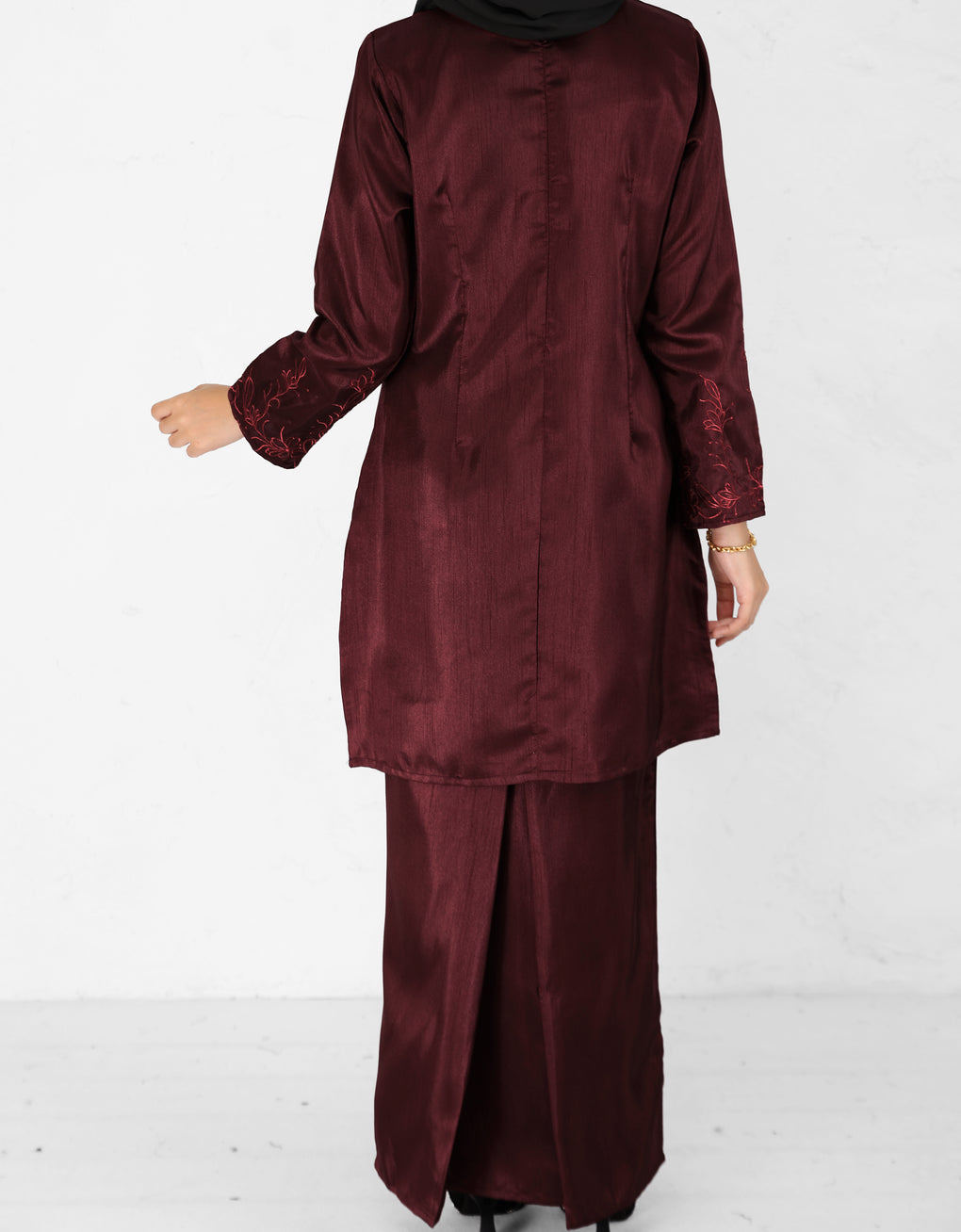 "Baju Kurung Pahang Moden Fianna" made from Shantung Embroidery. This garment features a long, graceful cut that brings out its elegant appeal. It's perfect for formal occasions or stylish everyday wear, making it a timeless piece for anyone who values both cultural heritage and modern fashion.