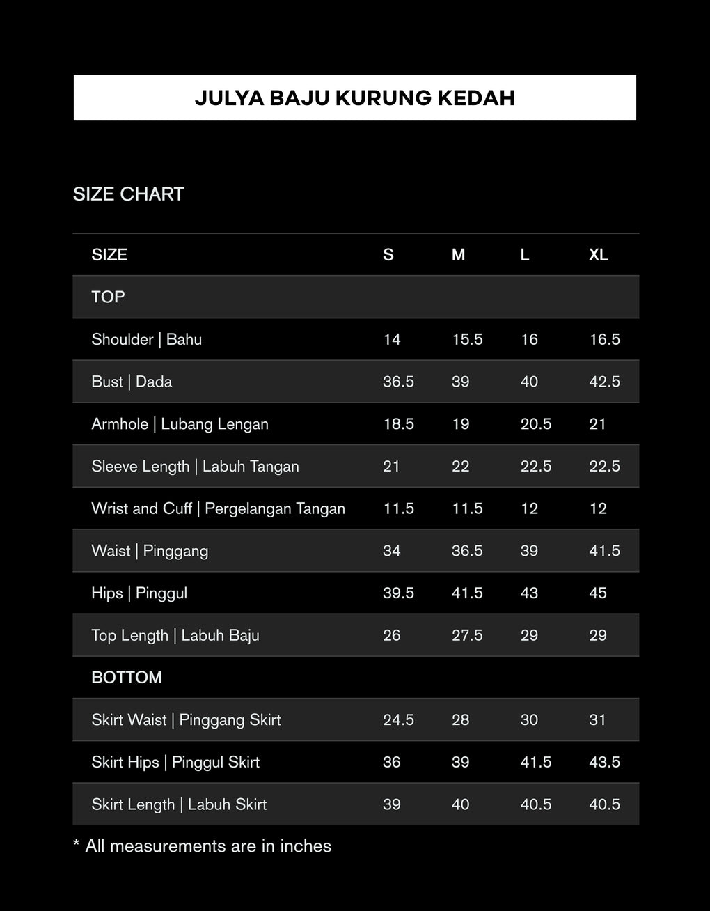 | Skirt Length | Labuh Skirt | 39 | 40 | 40.5 | 40.5 |