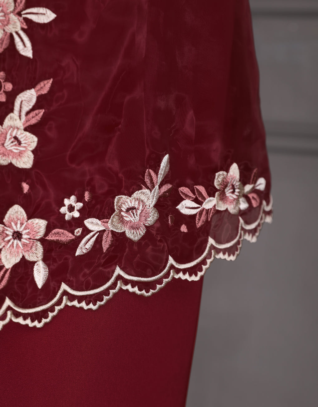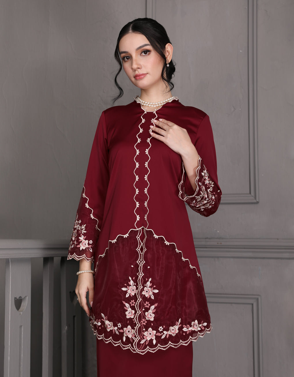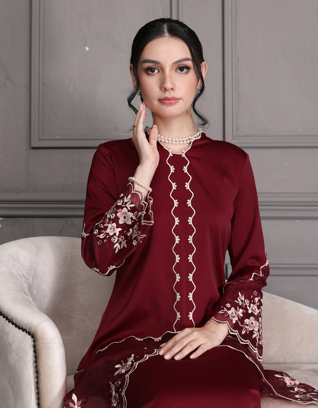 The 'Baju Kebaya Moden Lizy' is crafted from Italian Silky Satin with a scalloped neckline and detailed Embroidered Organza on the sleeves and hem. Elegant and refined—perfect for festive or formal occasions.