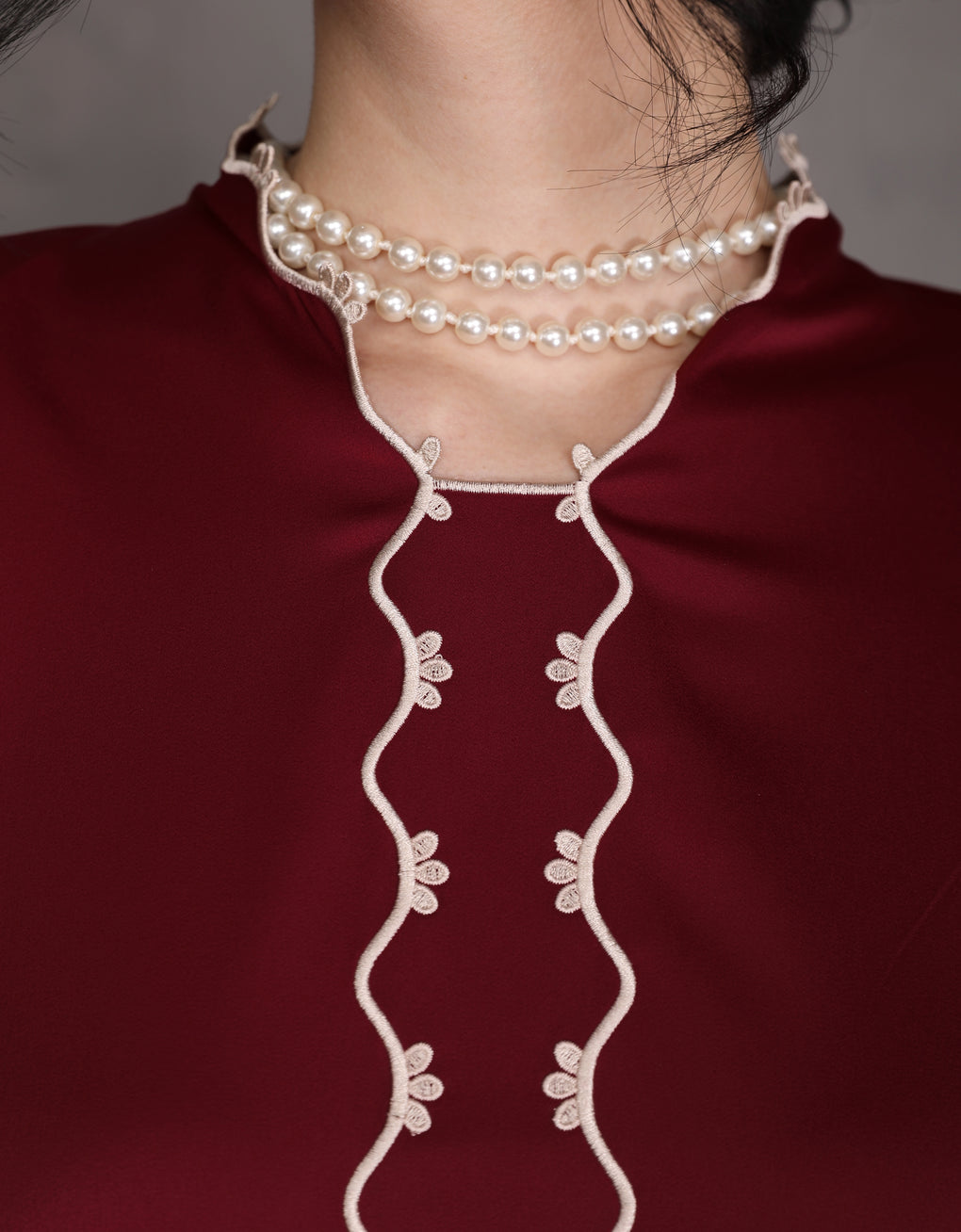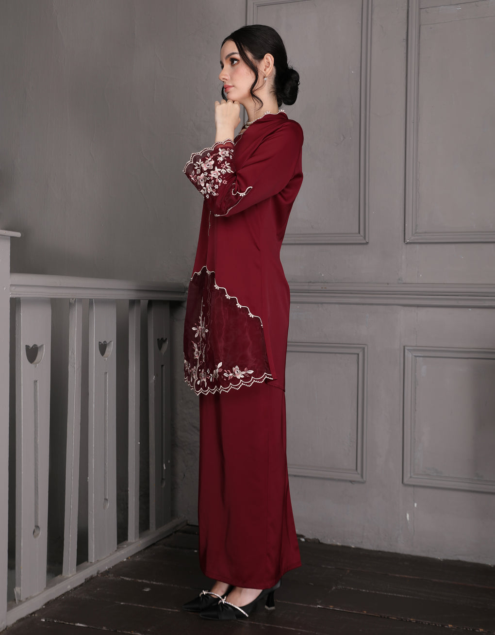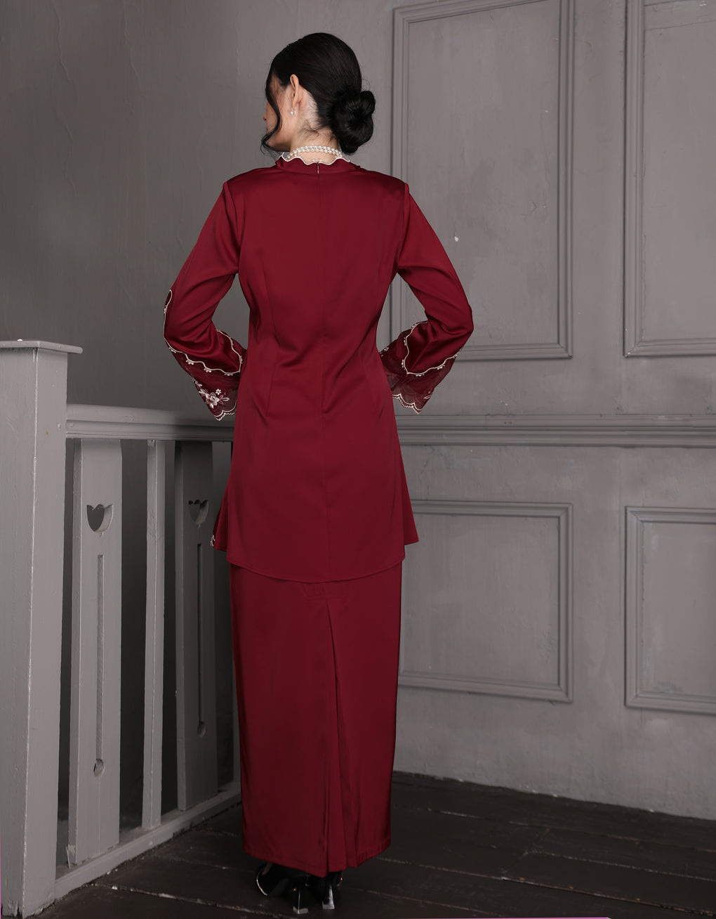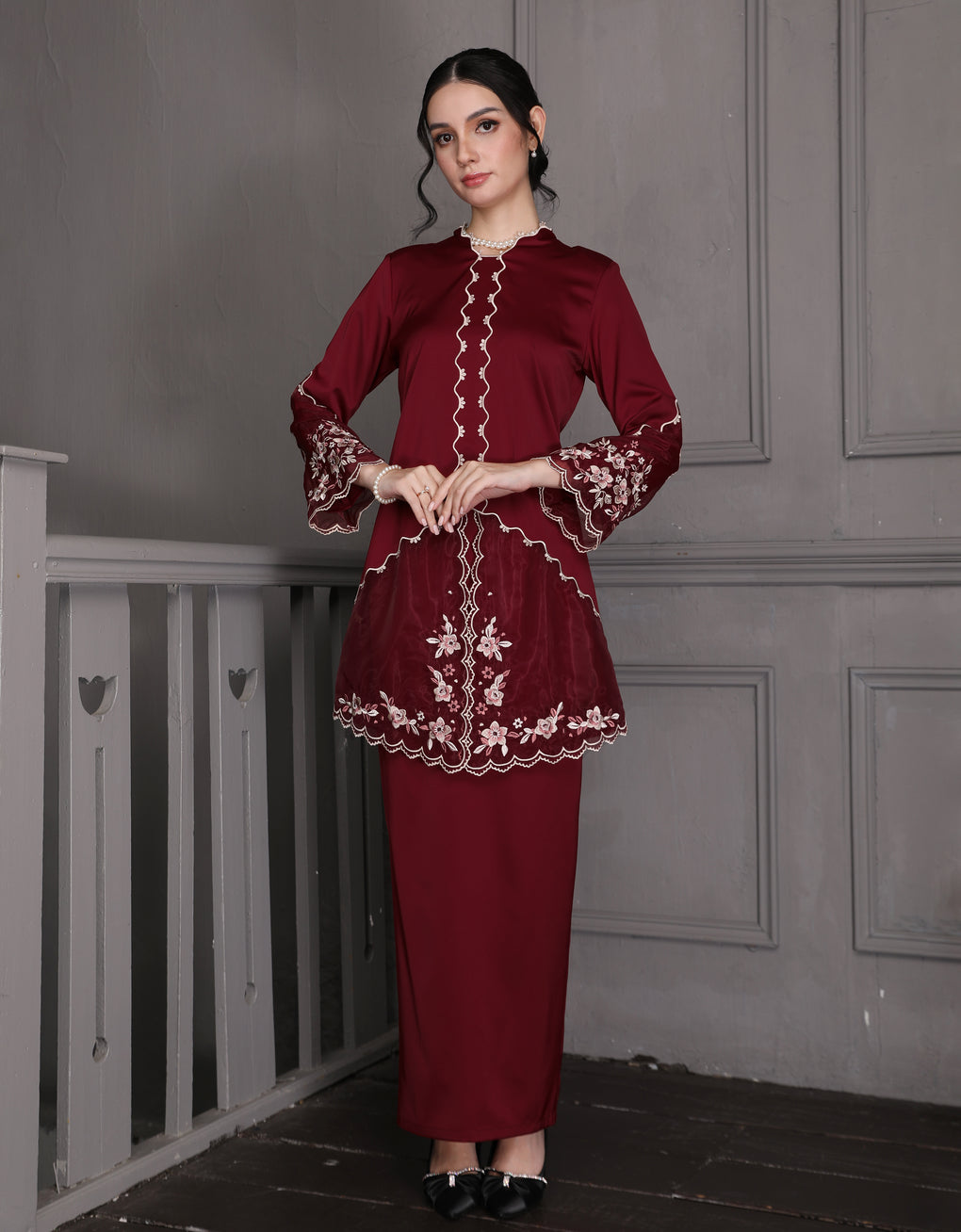 The 'Baju Kebaya Moden Lizy' is crafted from Italian Silky Satin with a scalloped neckline and detailed Embroidered Organza on the sleeves and hem. Elegant and refined—perfect for festive or formal occasions.