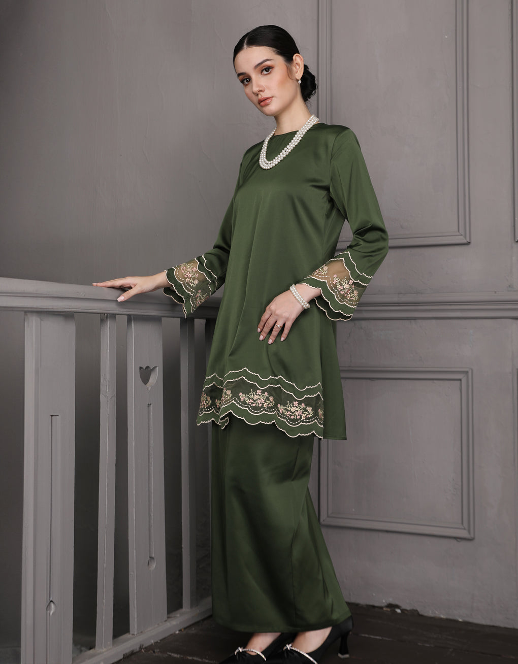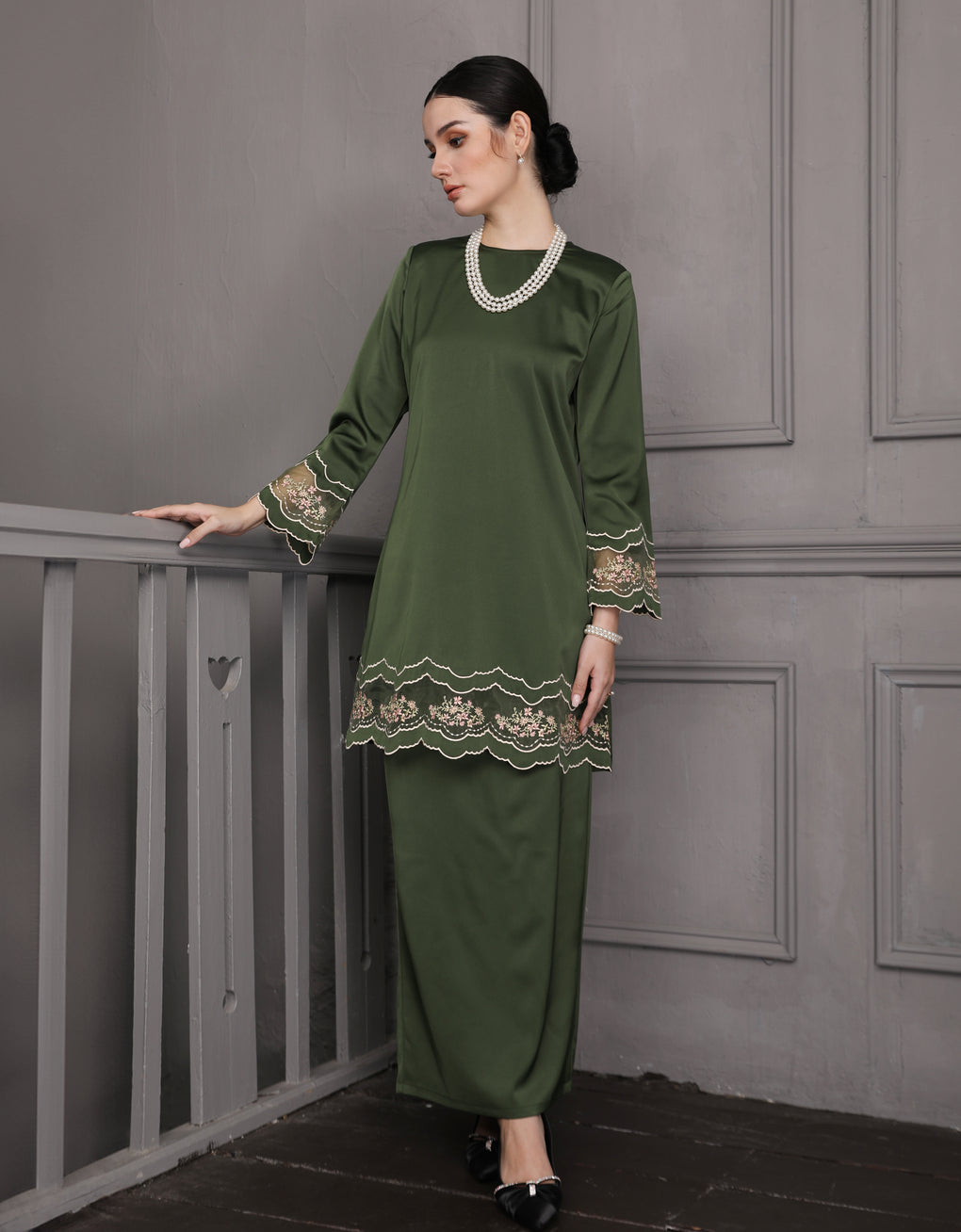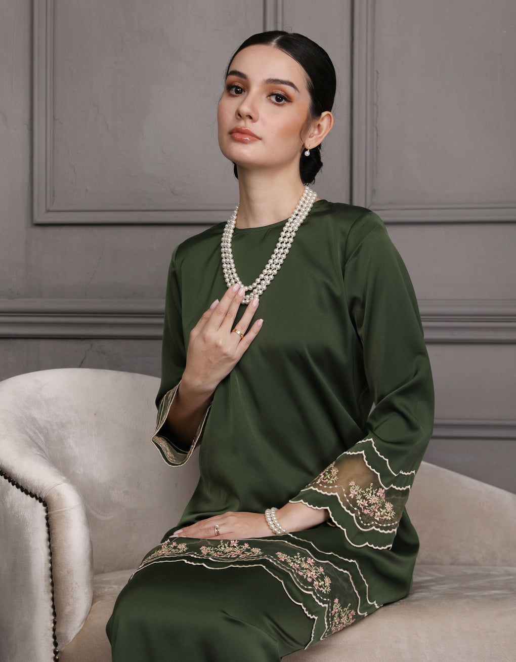 'Baju Kurung Pahang Moden Everlee' blends tradition with a modern touch. Crafted from luxurious Italian Silky Satin and adorned with multi-color embroidery, it offers both elegance and comfort in a long, flattering silhouette. A timeless choice for formal events or refined everyday wear.