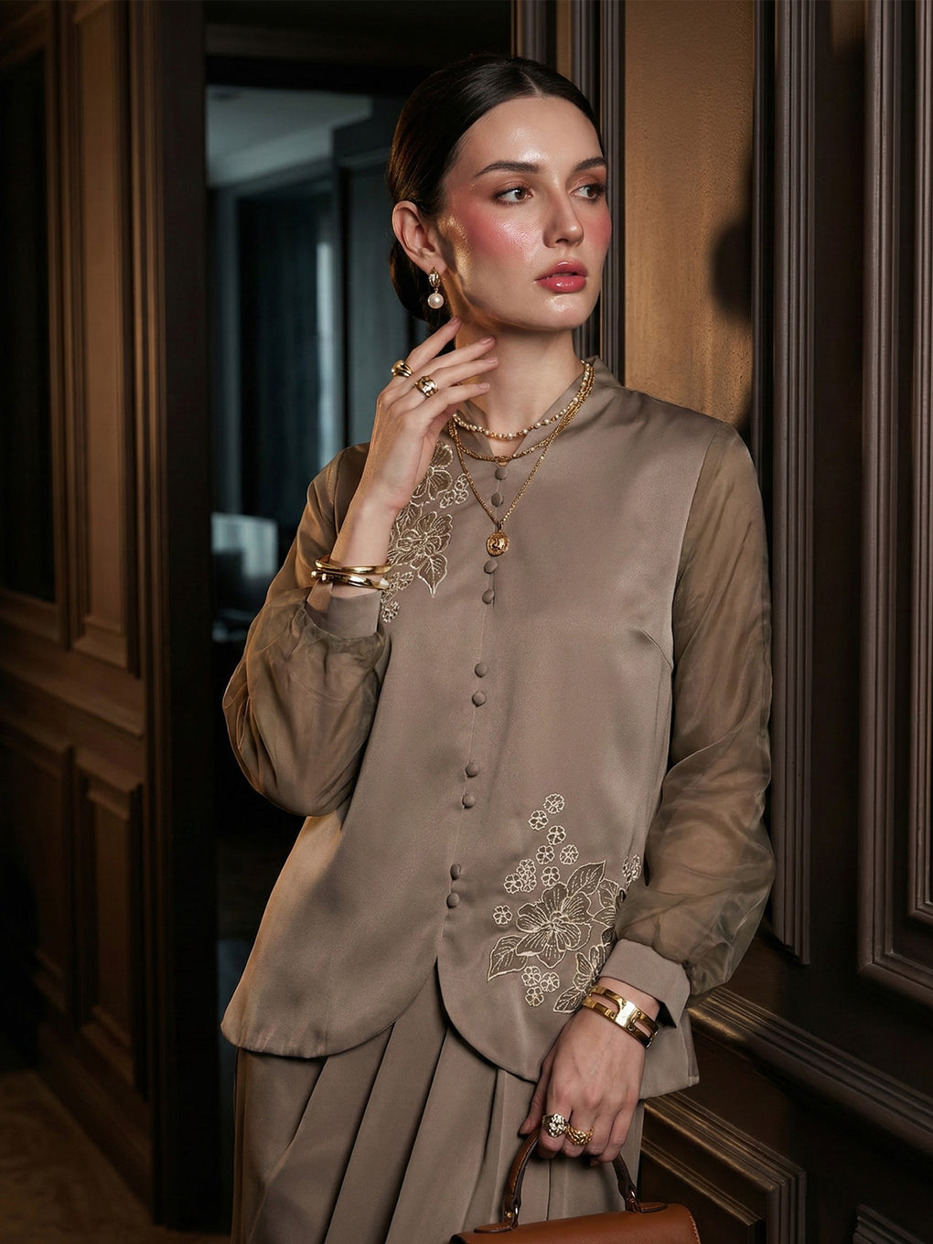 Crafted from premium satin, this "Baju Kurung Moden Alivia" features delicate floral patching embroidery and elegant button detailing. The flowy bishop sleeves and draped skirt complete the modern, graceful silhouette—perfect for formal or festive occasions.
