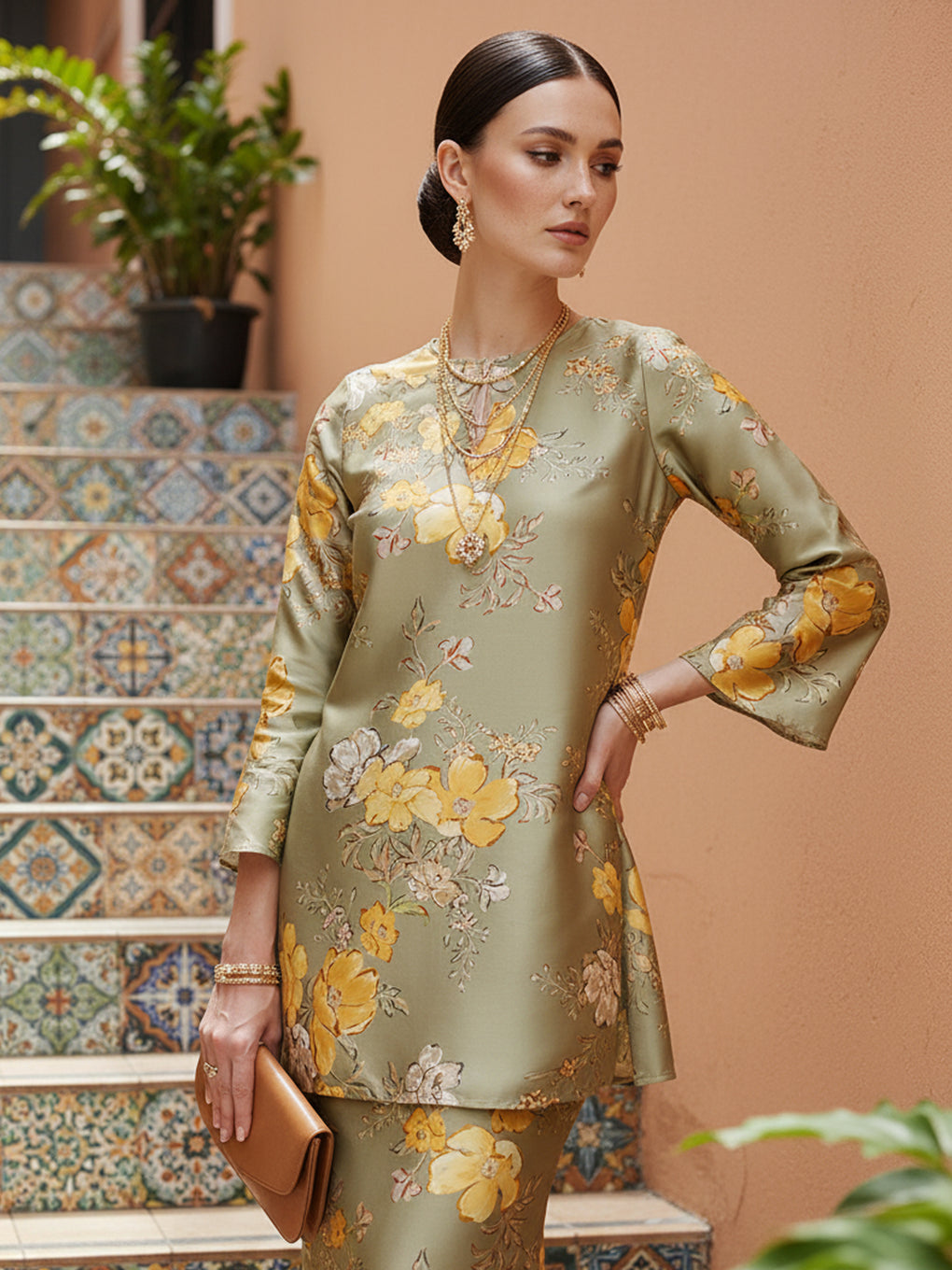 Material: Diore Silky Satin - The satin silk fabric boasts a glossy and elegant drape, featuring exclusive prints that add a touch of luster to the garment.