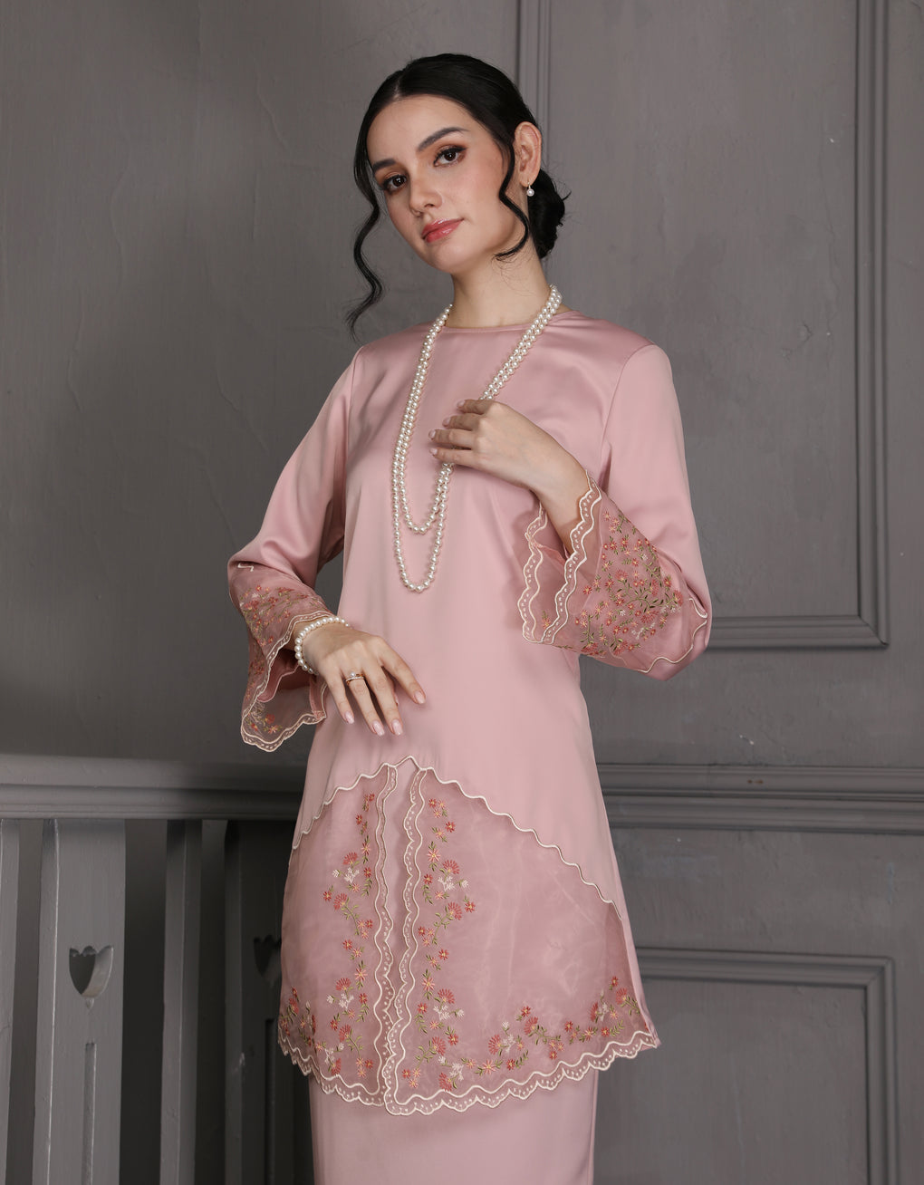 'Baju Kurung Pahang Moden Aurelia' blends tradition with a modern touch. Made from premium Italian Silky Satin, this piece features delicate embroidery on soft organdy that enhances its refined look. It offers both elegance and comfort in a long, flattering silhouette. A timeless choice for formal events or refined everyday wear.