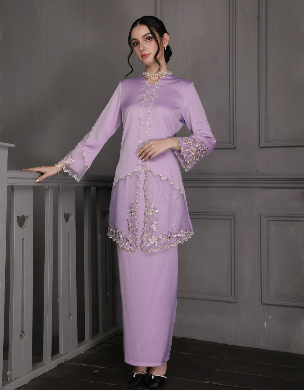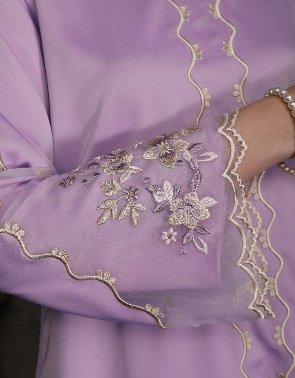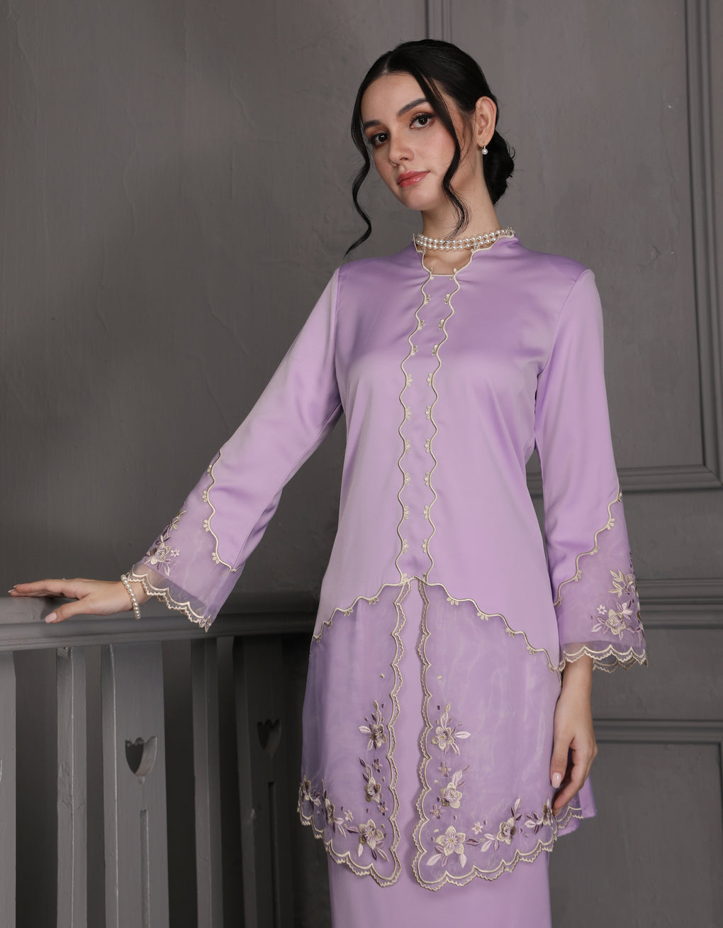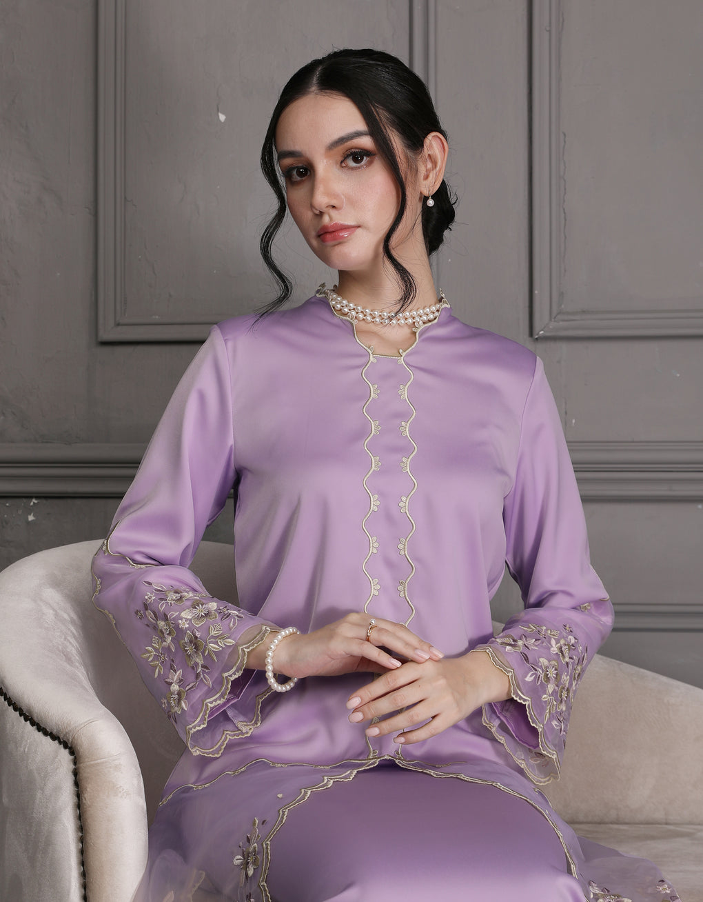 The 'Baju Kebaya Moden Lizy' is crafted from Italian Silky Satin with a scalloped neckline and detailed Embroidered Organza on the sleeves and hem. Elegant and refined—perfect for festive or formal occasions.
