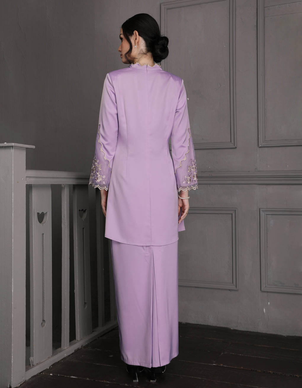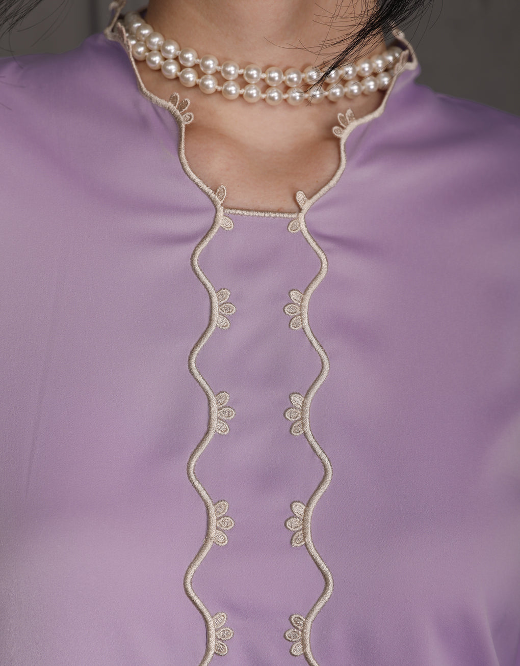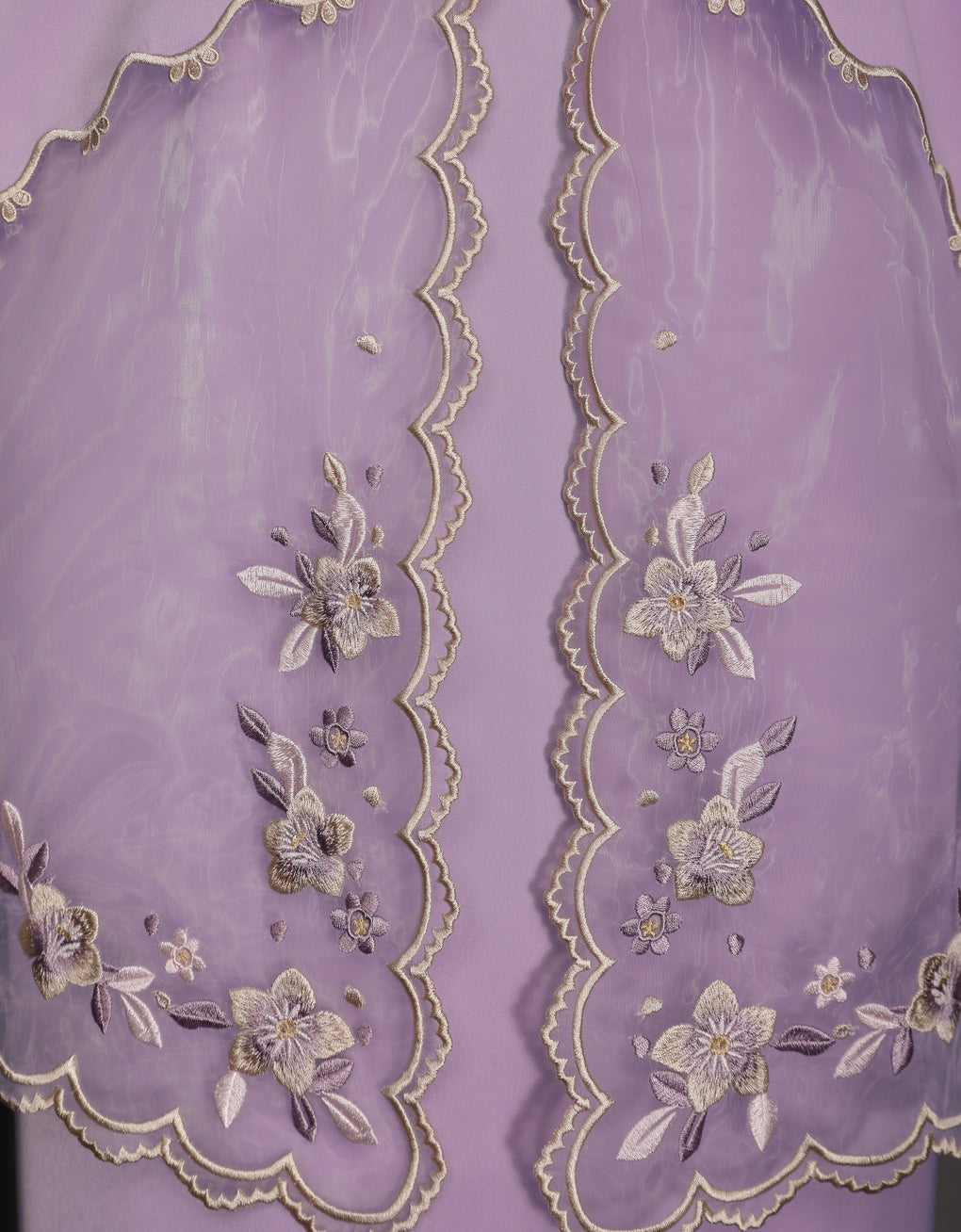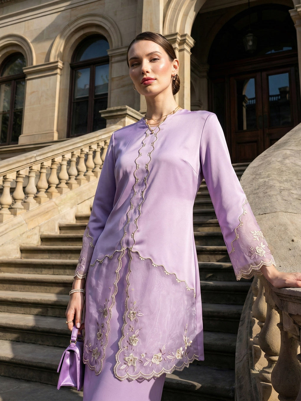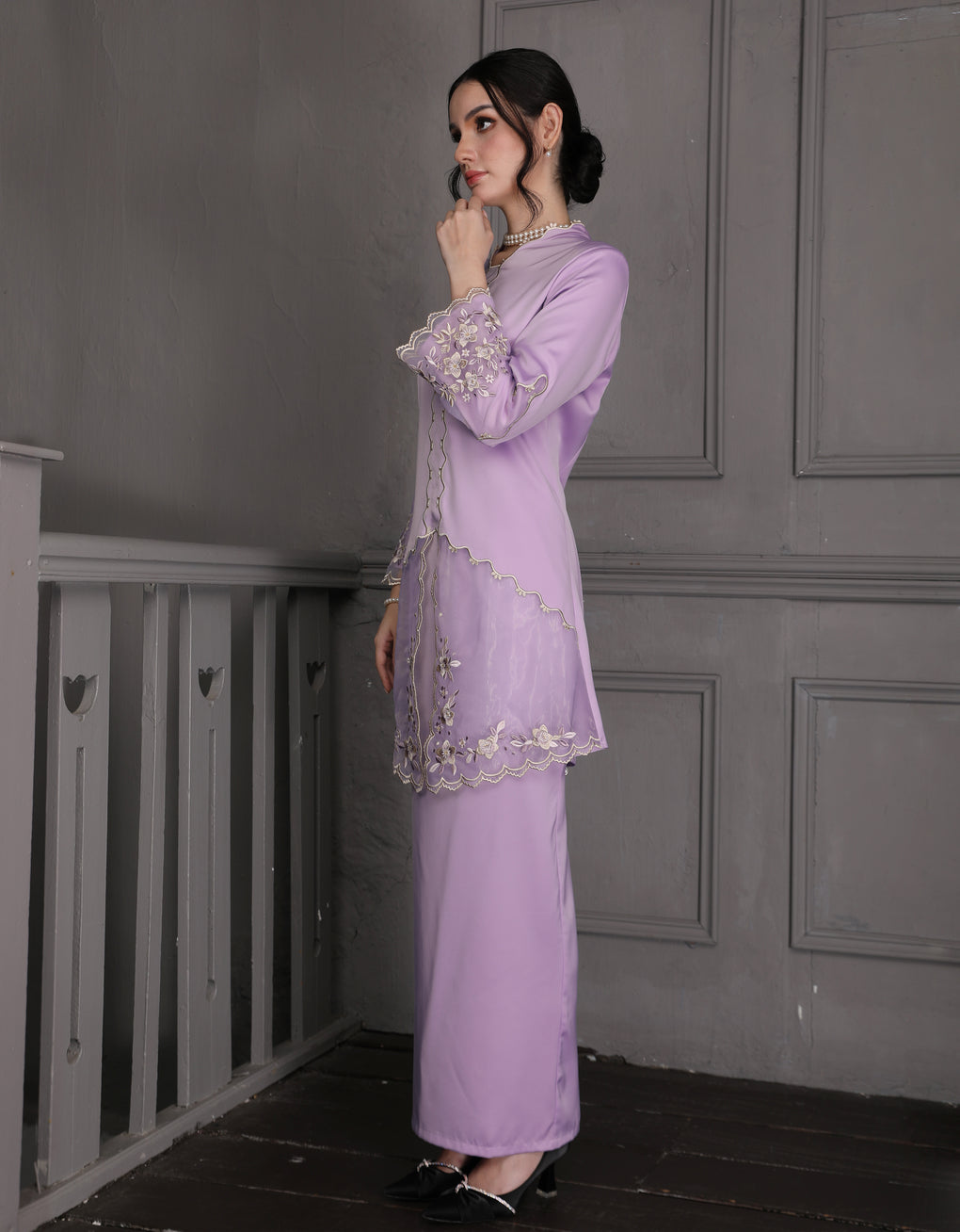 The 'Baju Kebaya Moden Lizy' is crafted from Italian Silky Satin with a scalloped neckline and detailed Embroidered Organza on the sleeves and hem. Elegant and refined—perfect for festive or formal occasions.