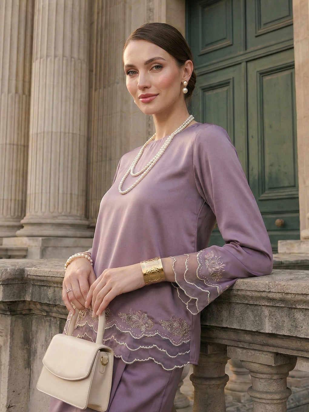'Baju Kurung Moden Harriet’ combines classic charm with modern elegance. Made from silky Italian satin and detailed with fine multicolor embroidery on the sleeves and hem, it looks stunning, luxurious, and feminine — perfect for formal events or graceful daily wear.