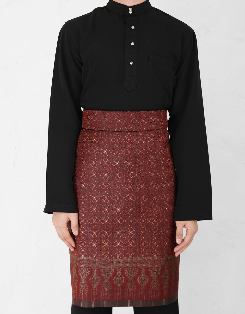 No matter the Baju Melayu style, Samping is the statement piece that completes the traditional attire. The most common style is the 'ikatan lingkup' where the sampin is first folded tightly across the chest, then rolled down to hold the cloth in place.