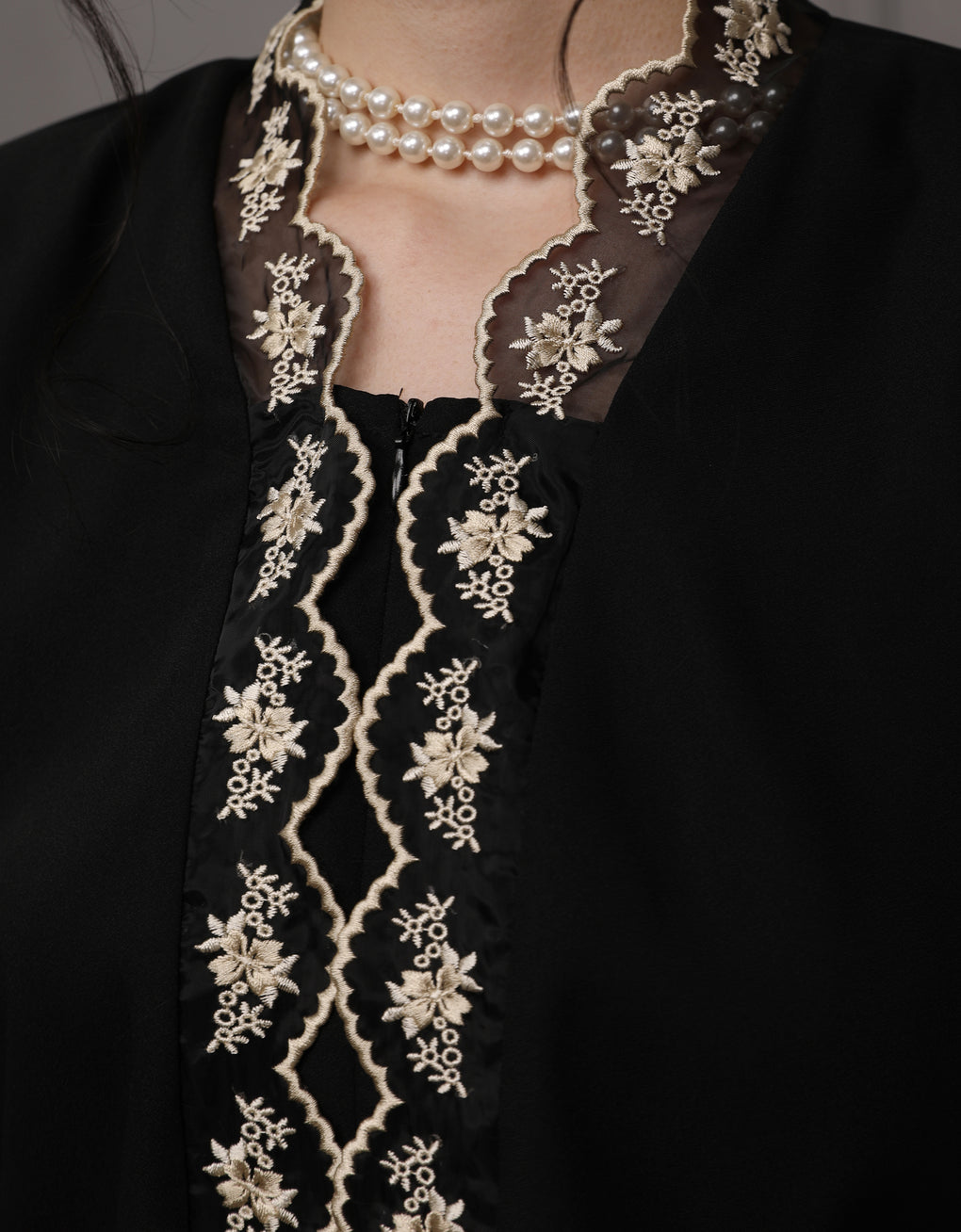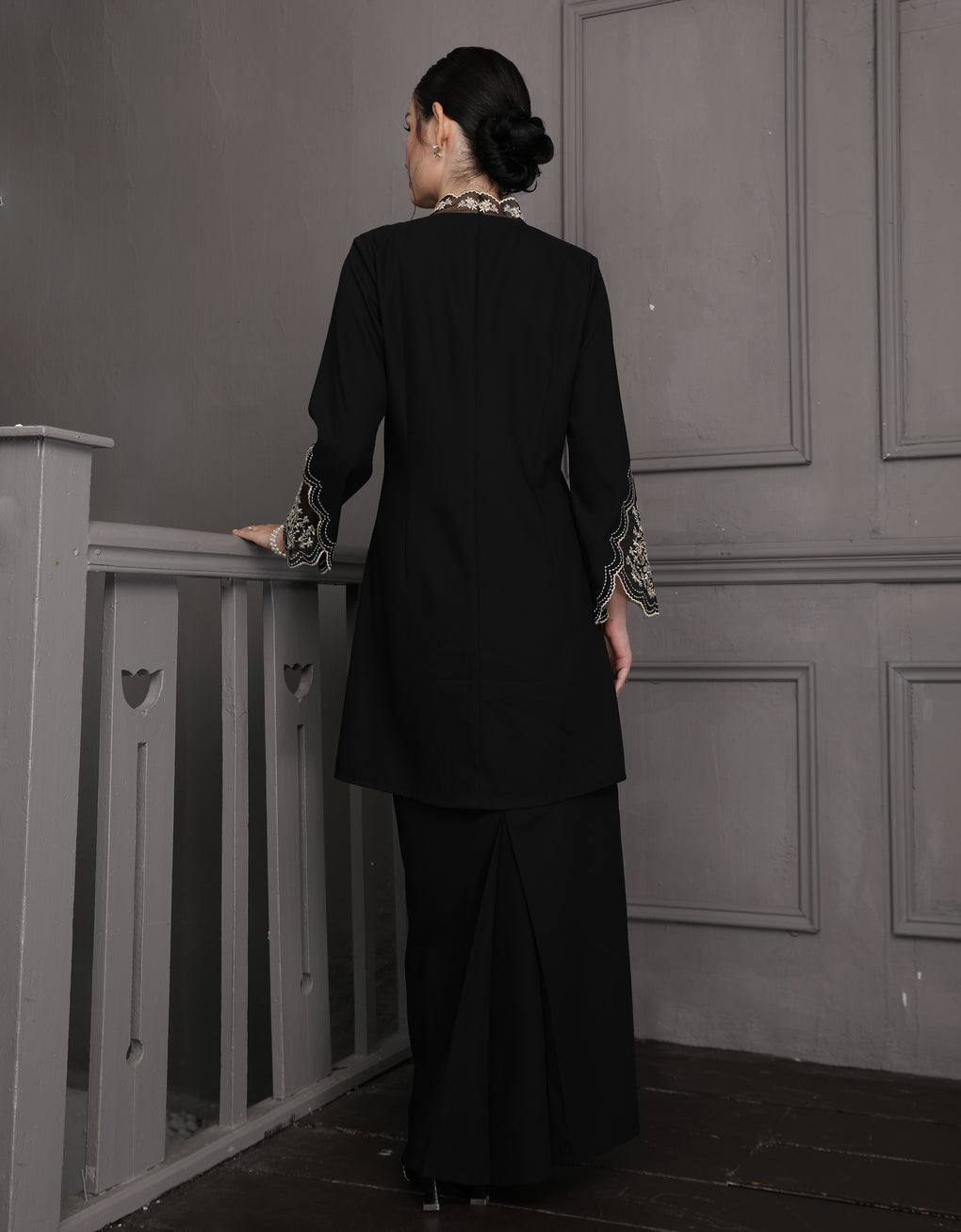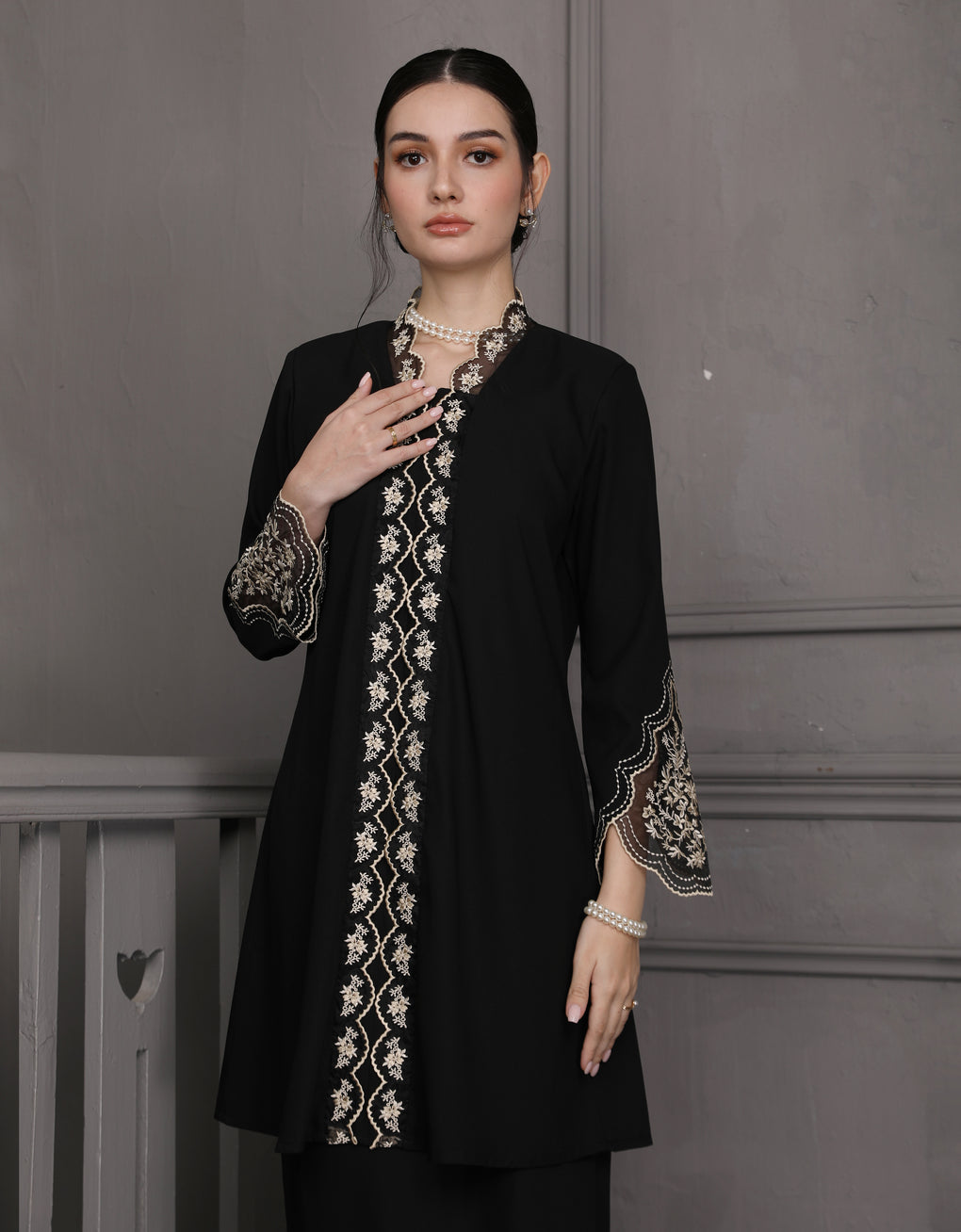 The 'Baju Kebaya Felisa' features luxurious Italian Silky Satin fabric, offering a smooth and elegant drape. Its scalloped neckline adds a refined touch, while the intricate Embroidered Organza detailing on the center and sleeves enhances its sophisticated appeal. This kebaya is an excellent choice for festive celebrations or formal events, combining traditional craftsmanship with contemporary elegance.