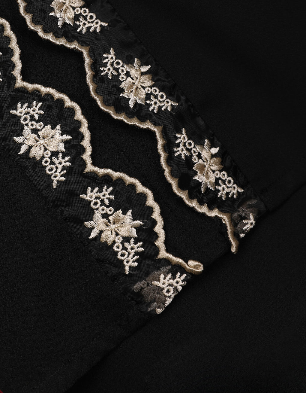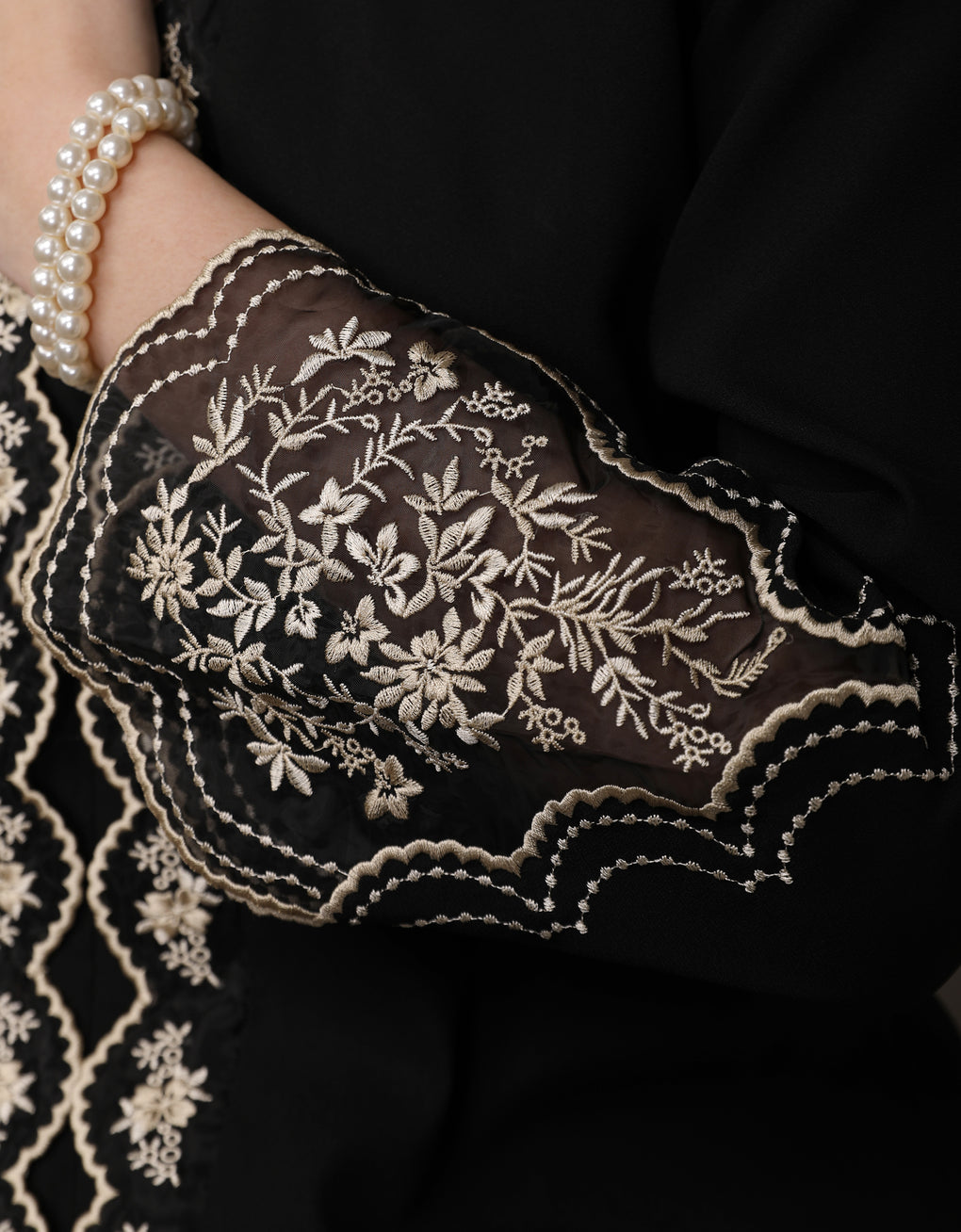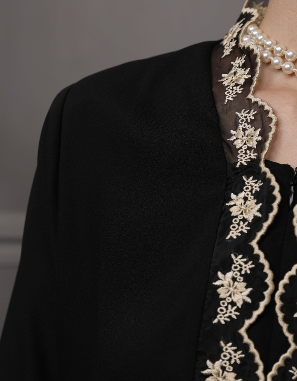 The 'Baju Kebaya Felisa' features luxurious Italian Silky Satin fabric, offering a smooth and elegant drape. Its scalloped neckline adds a refined touch, while the intricate Embroidered Organza detailing on the center and sleeves enhances its sophisticated appeal. This kebaya is an excellent choice for festive celebrations or formal events, combining traditional craftsmanship with contemporary elegance.