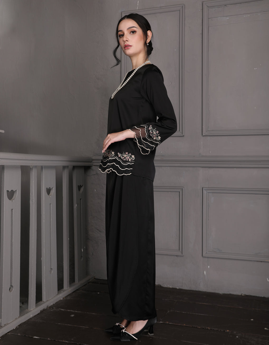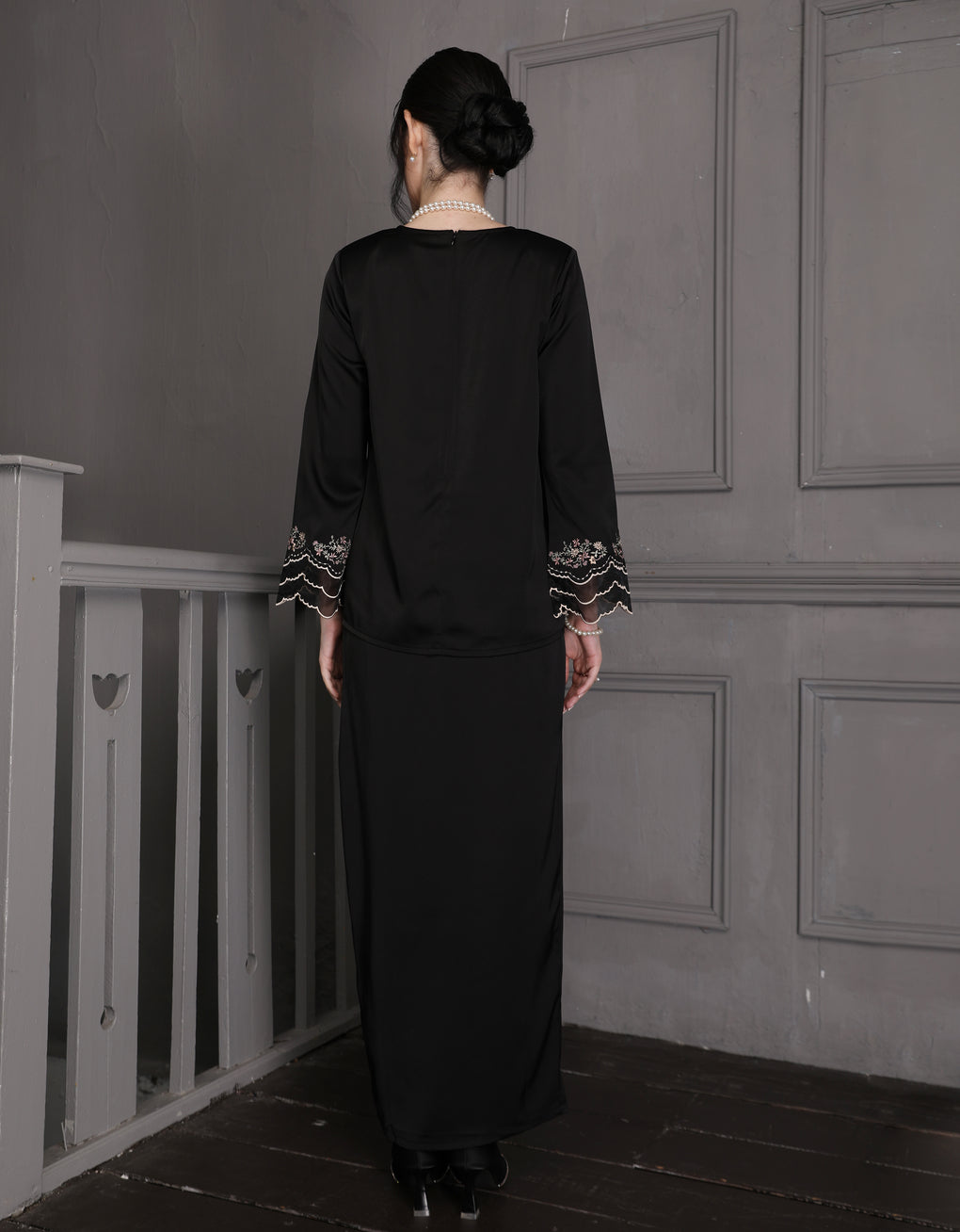 'Baju Kurung Moden Harriet’ combines classic charm with modern elegance. Made from silky Italian satin and detailed with fine multicolor embroidery on the sleeves and hem, it looks stunning, luxurious, and feminine — perfect for formal events or graceful daily wear.