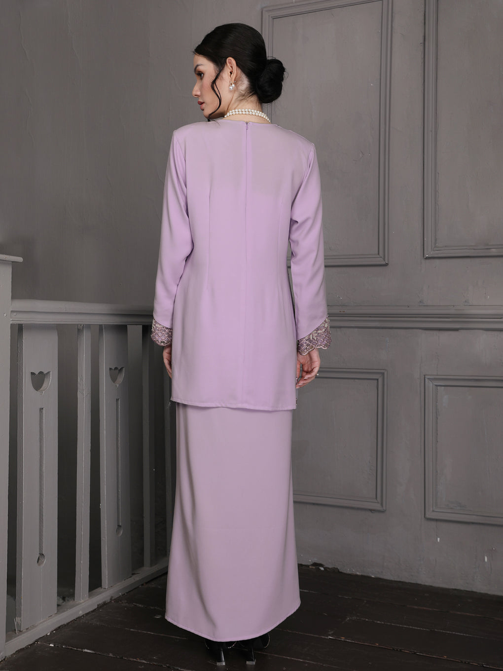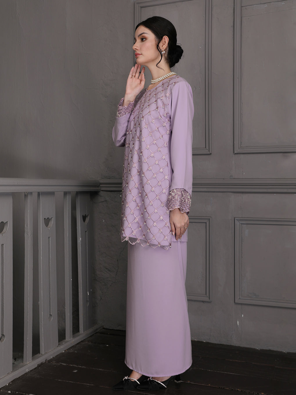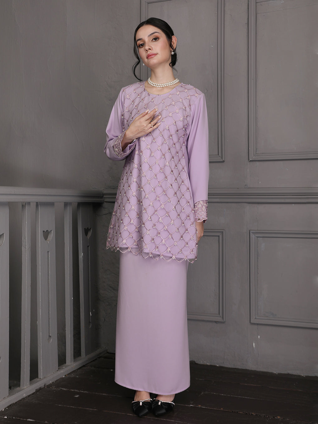 Baju Kurung Moden Idalia Luxurious and exclusive beaded lace delicately sewn for a rich and stunning look. The interlining are made of soft hand-feel jojo crepe fabric.