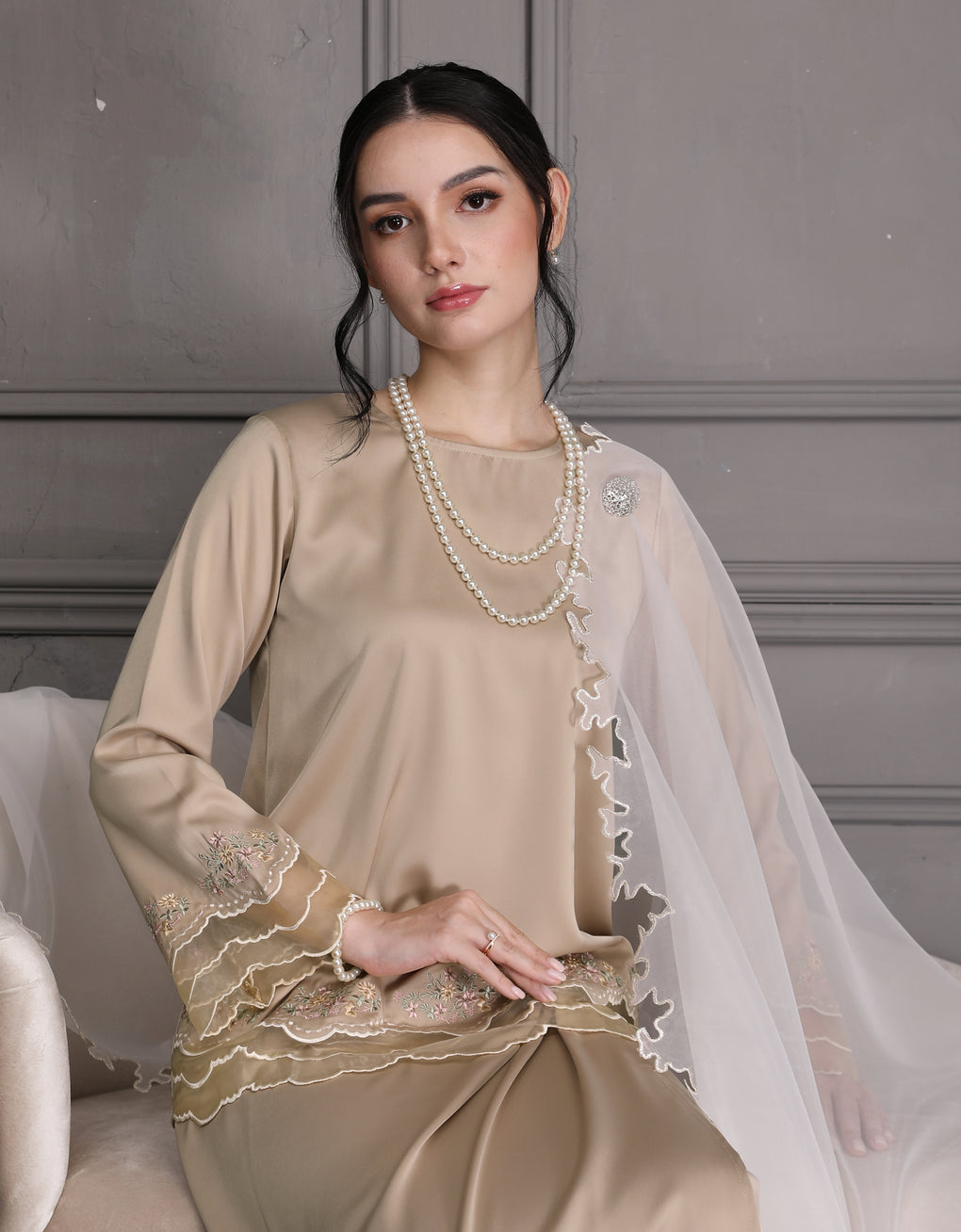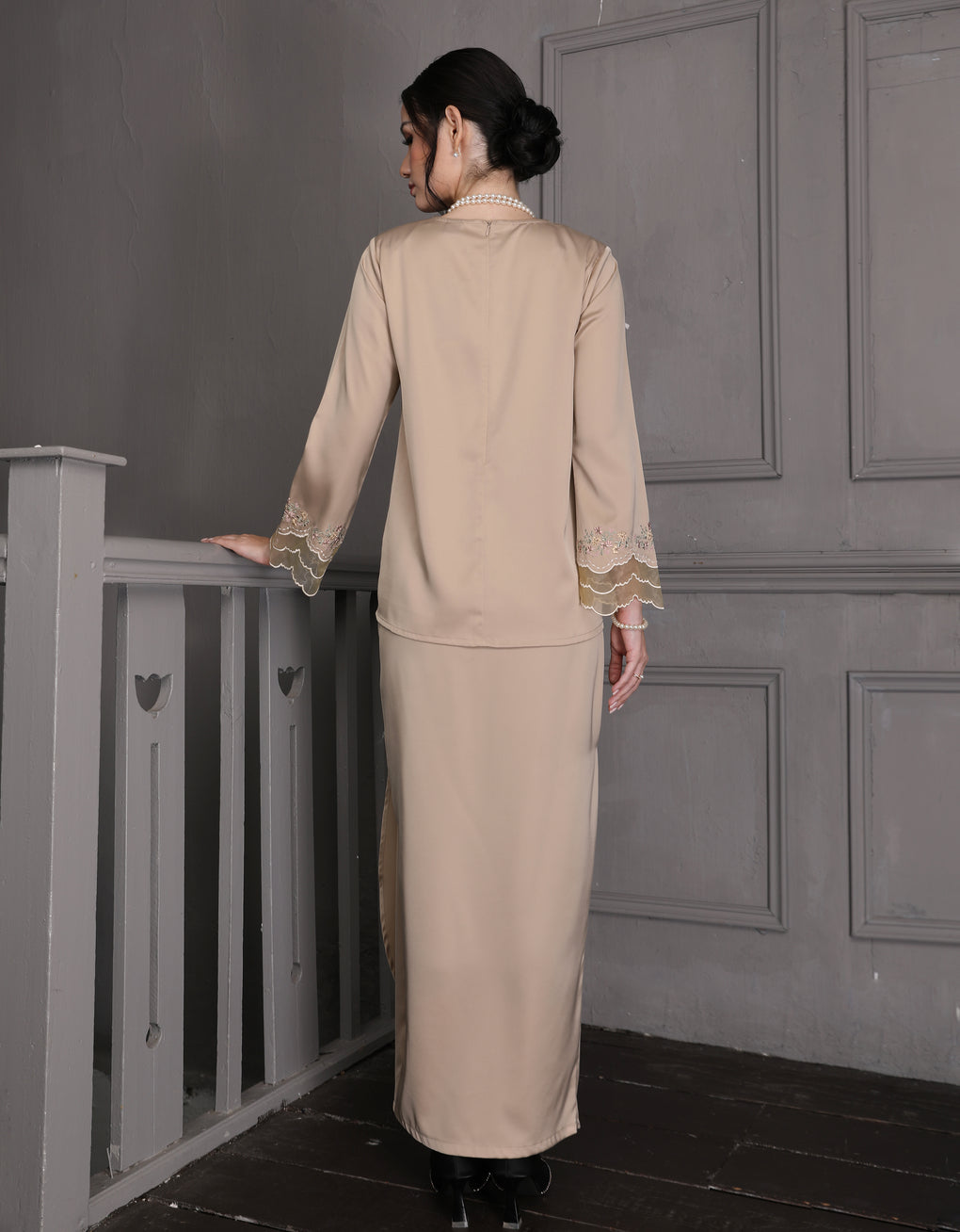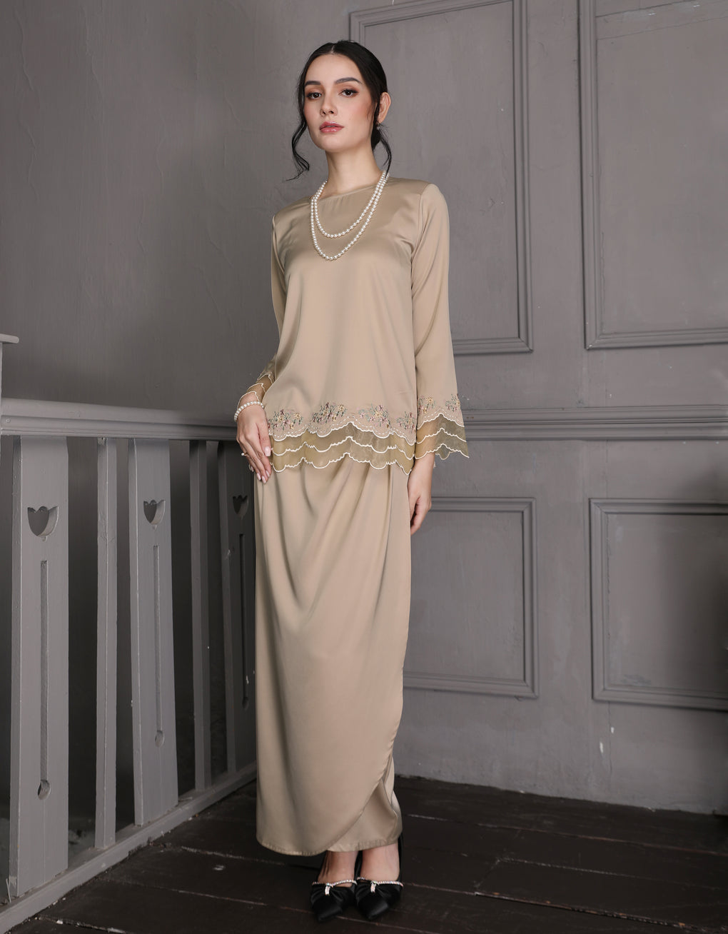 'Baju Kurung Moden Harriet’ combines classic charm with modern elegance. Made from silky Italian satin and detailed with fine multicolor embroidery on the sleeves and hem, it looks stunning, luxurious, and feminine — perfect for formal events or graceful daily wear.