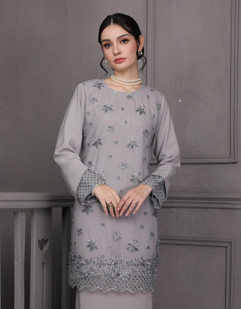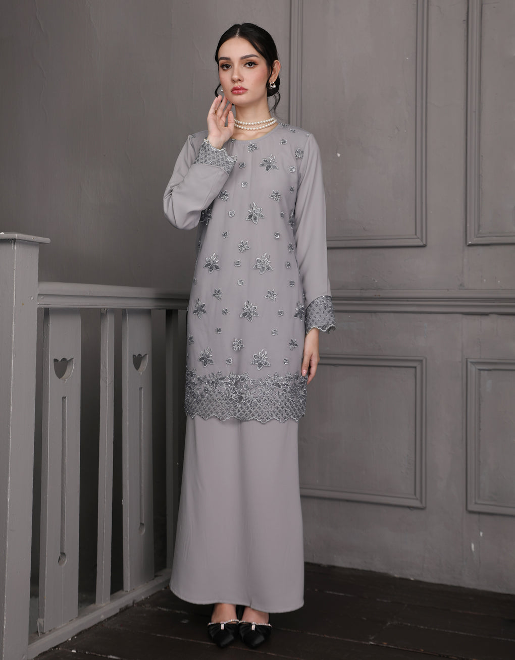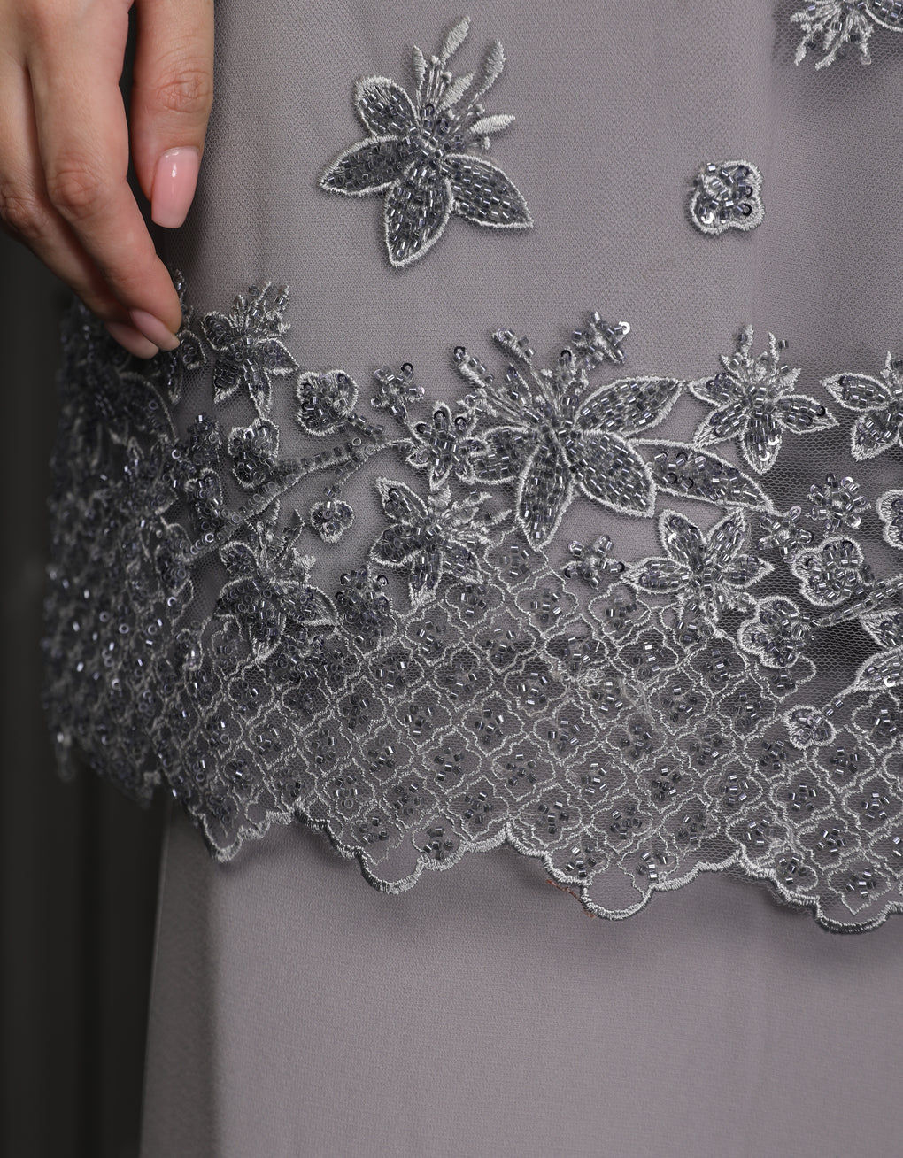 Baju Kurung Moden Rowena Luxurious and exclusive beaded lace delicately sewn for a rich and stunning look. The interlining are made of soft hand-feel jojo crepe fabric.