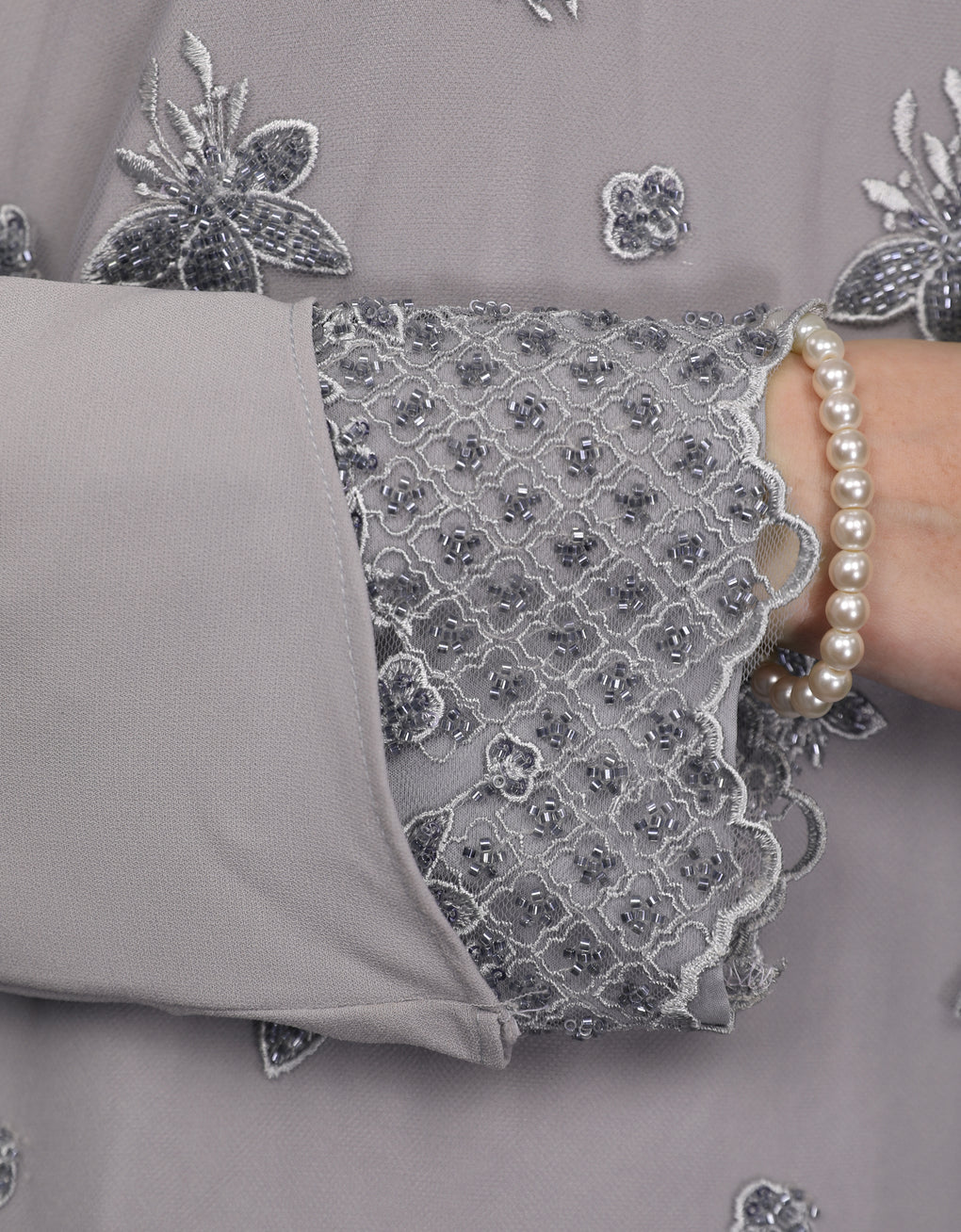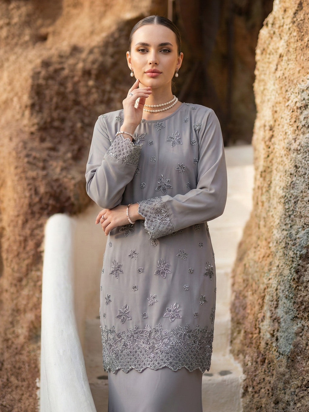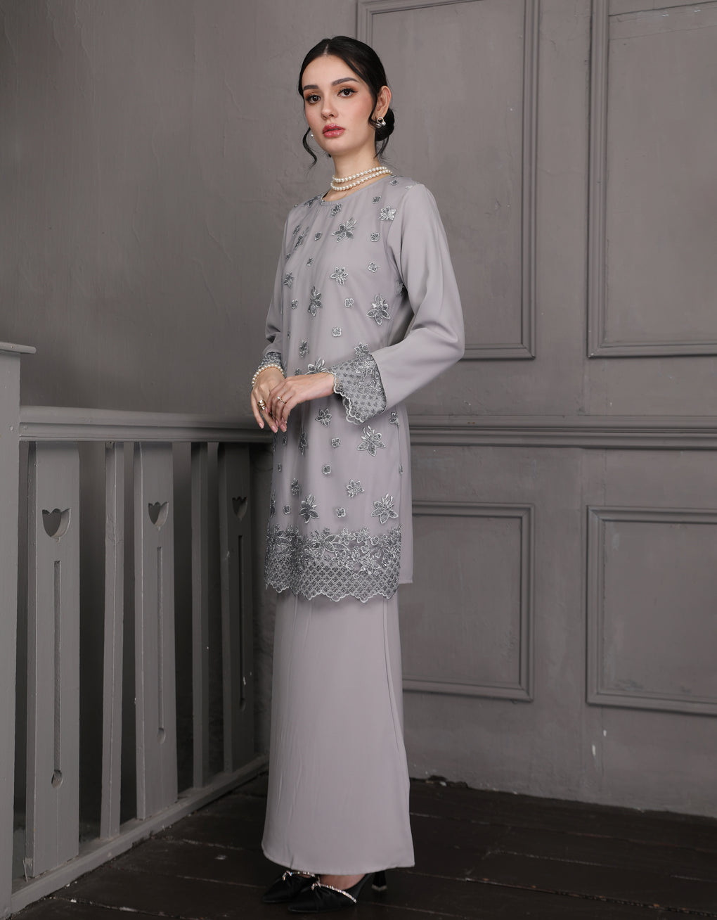 Baju Kurung Moden Rowena Luxurious and exclusive beaded lace delicately sewn for a rich and stunning look. The interlining are made of soft hand-feel jojo crepe fabric.