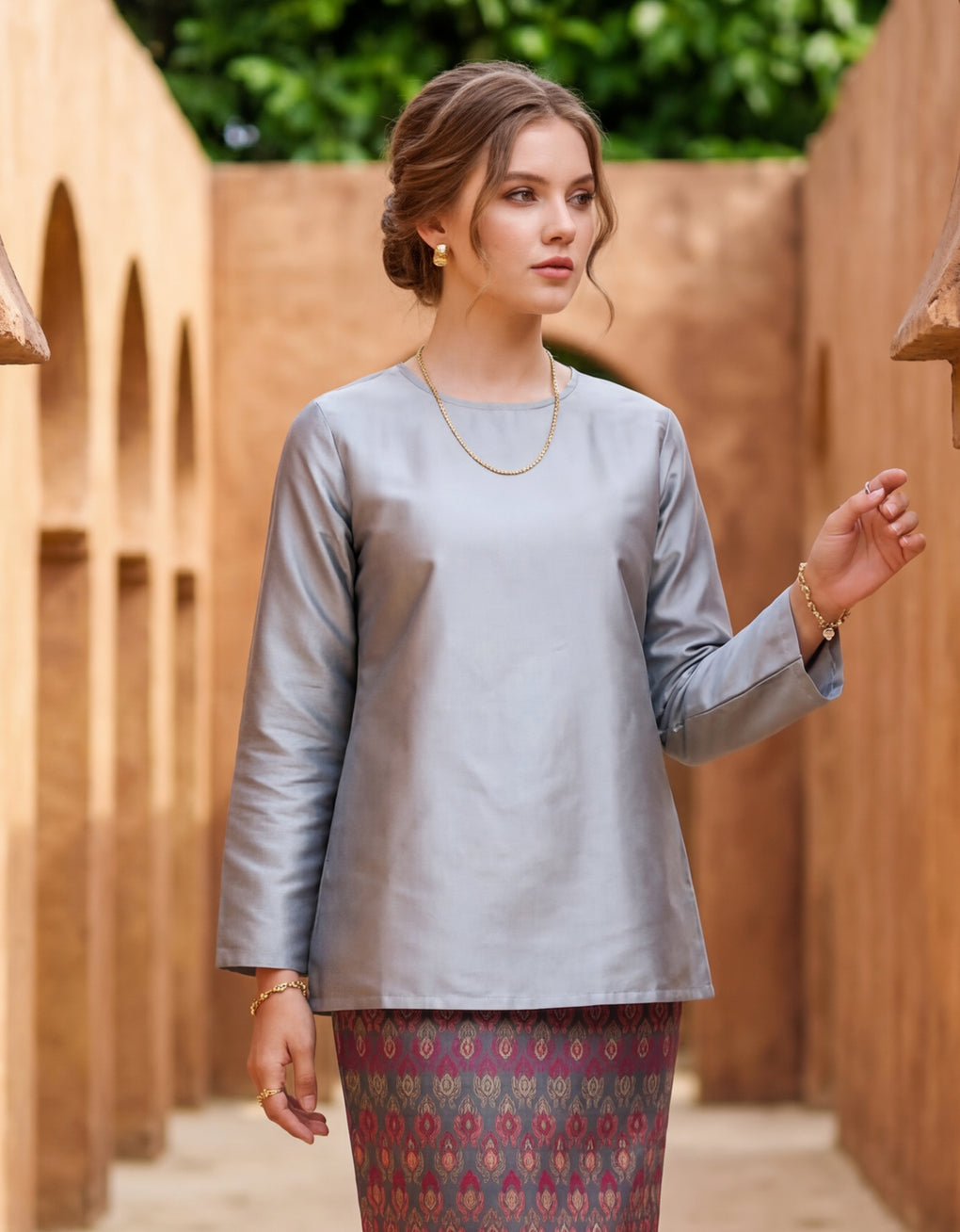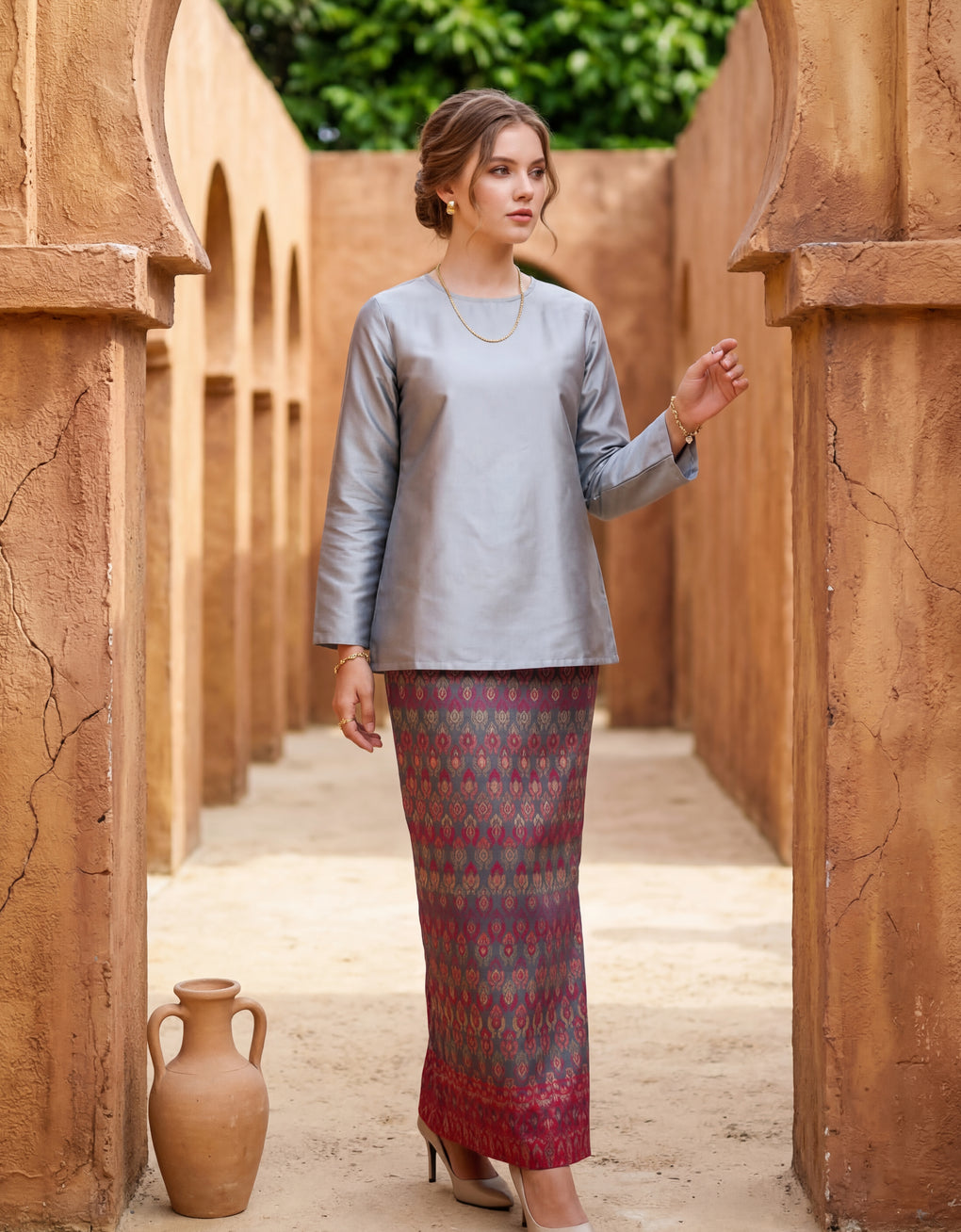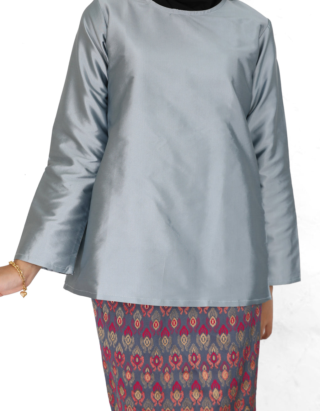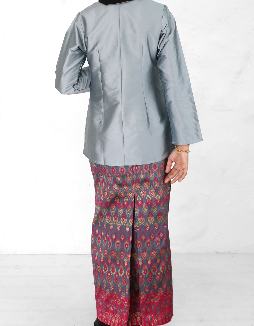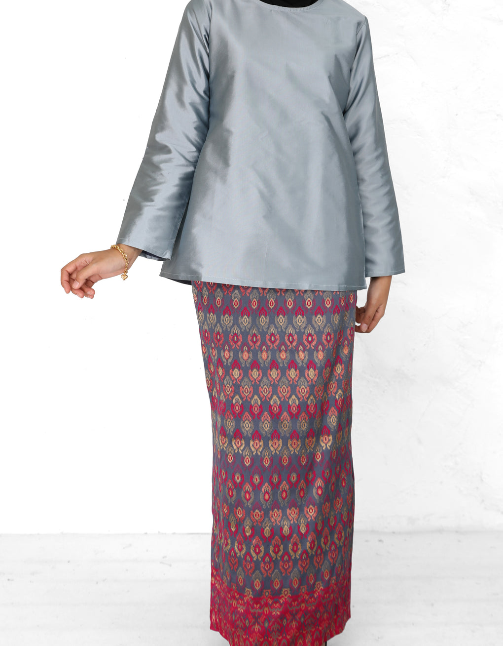 "Baju Kedah Teyja" blends timeless tradition with modern grace. Top Crafted from Tafetta and skirt from Jacquard. We serve you with four bolder colours options for this coming Raya. Pair it with either plain or printed scarves and you are good to go! It is a timeless piece which elevates our Karoline to look ultra feminine.