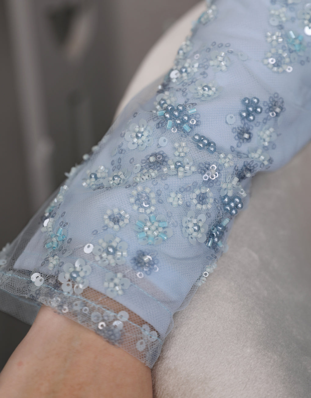 Luxurious and exclusive beaded lace delicately sewn for a rich and stunning look. The interlining are made of soft hand-feel jersey fabric.