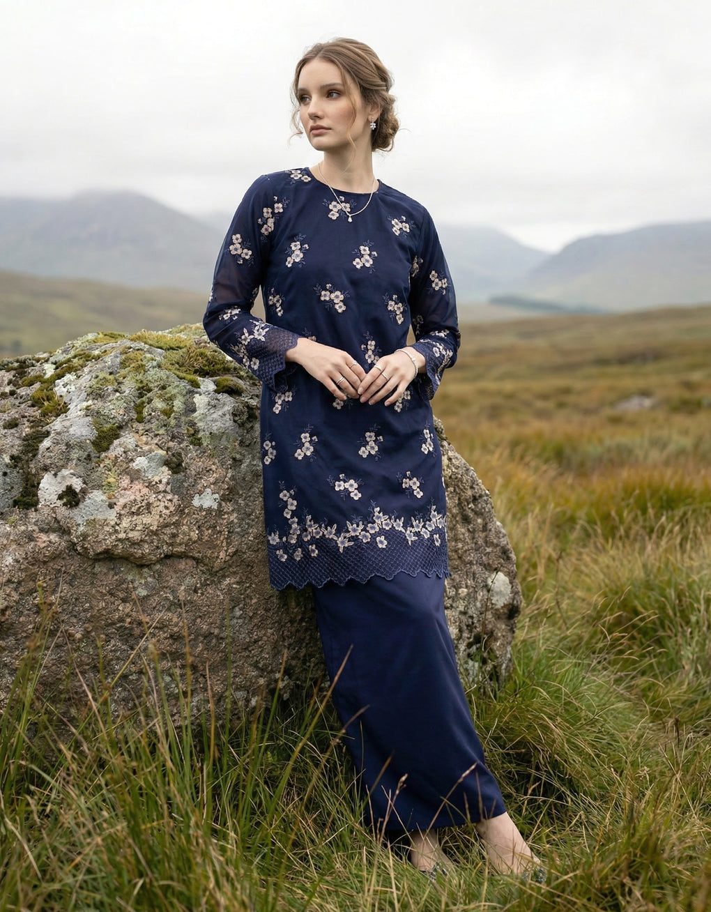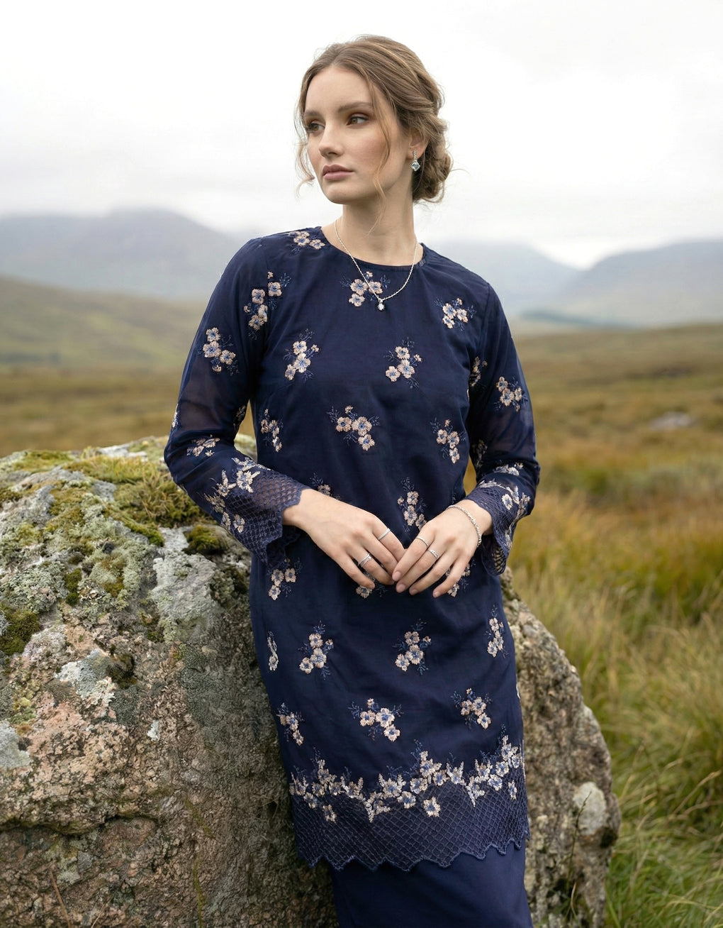 Crafted in a timeless Moden cut, this piece offers a comfortable fit. Delicate floral embroidered lace and a subtly geometric hem create a graceful blend of femininity and elegance perfect for any occasion.