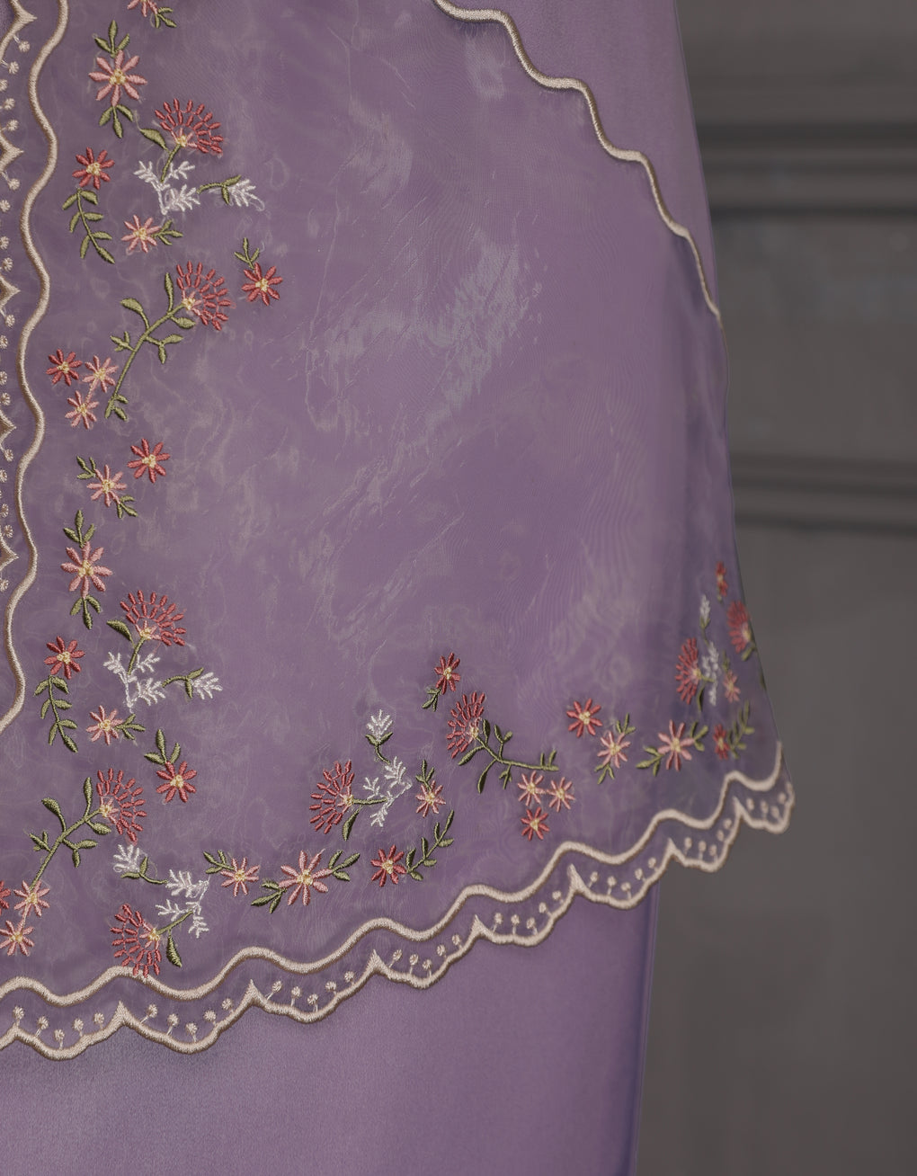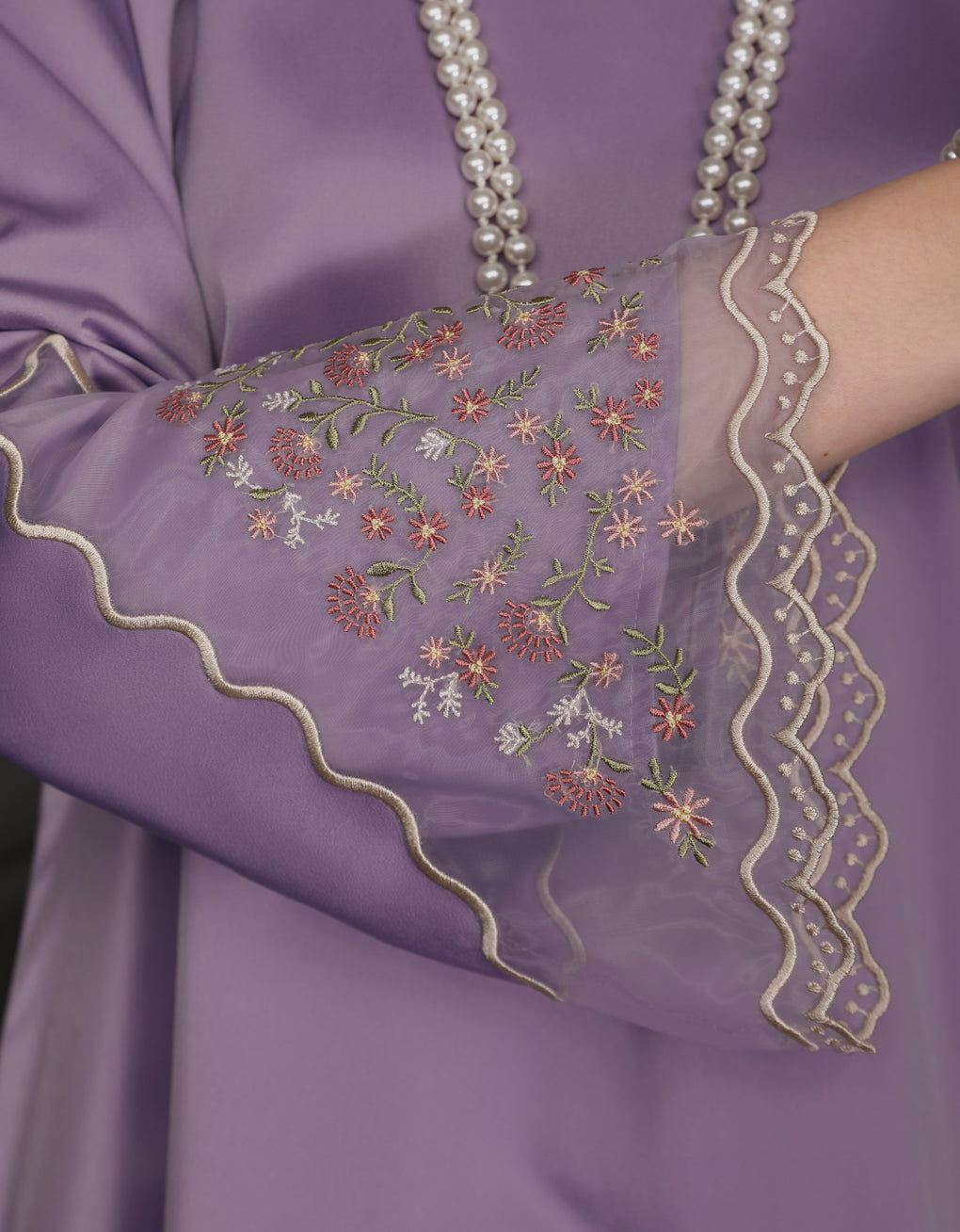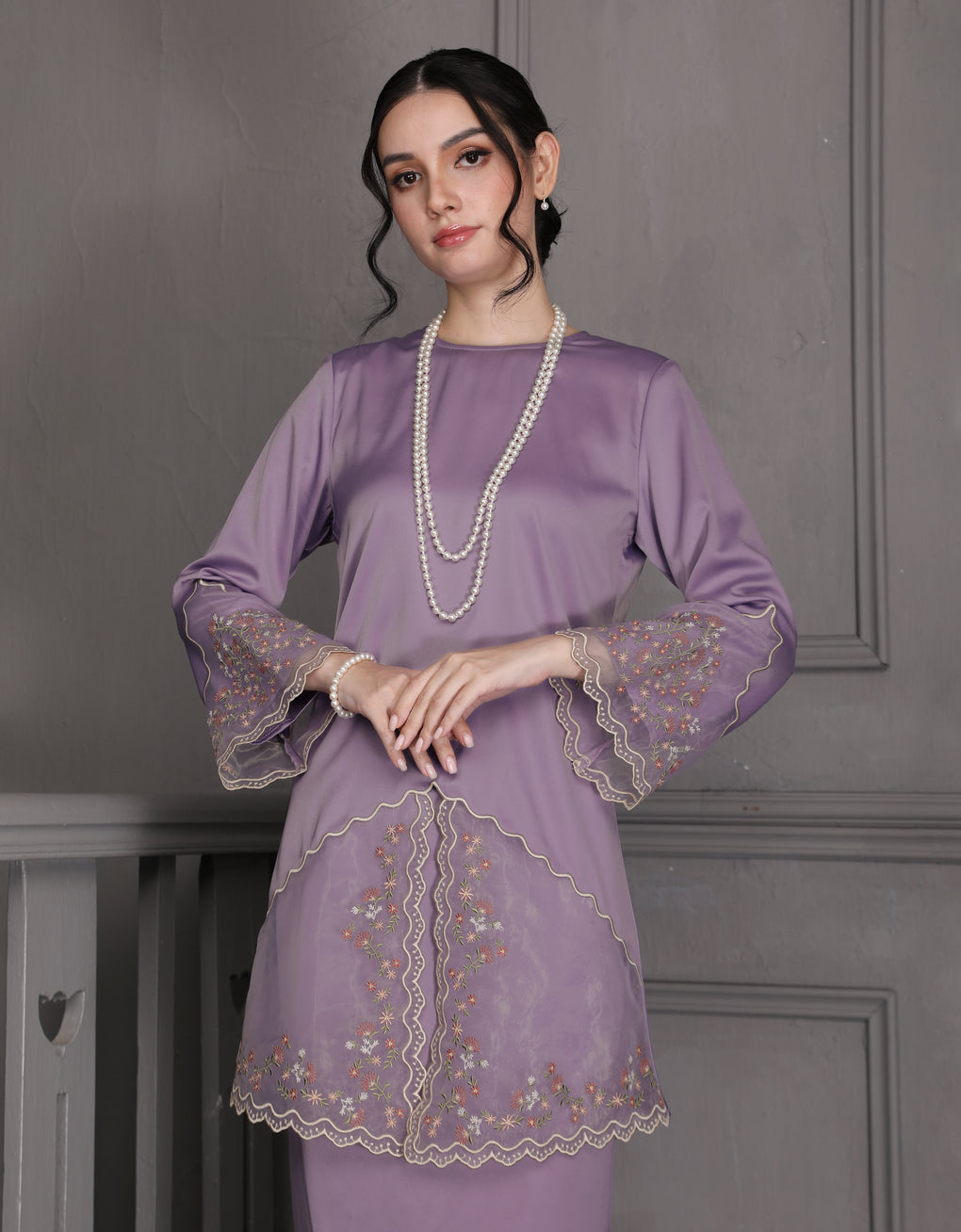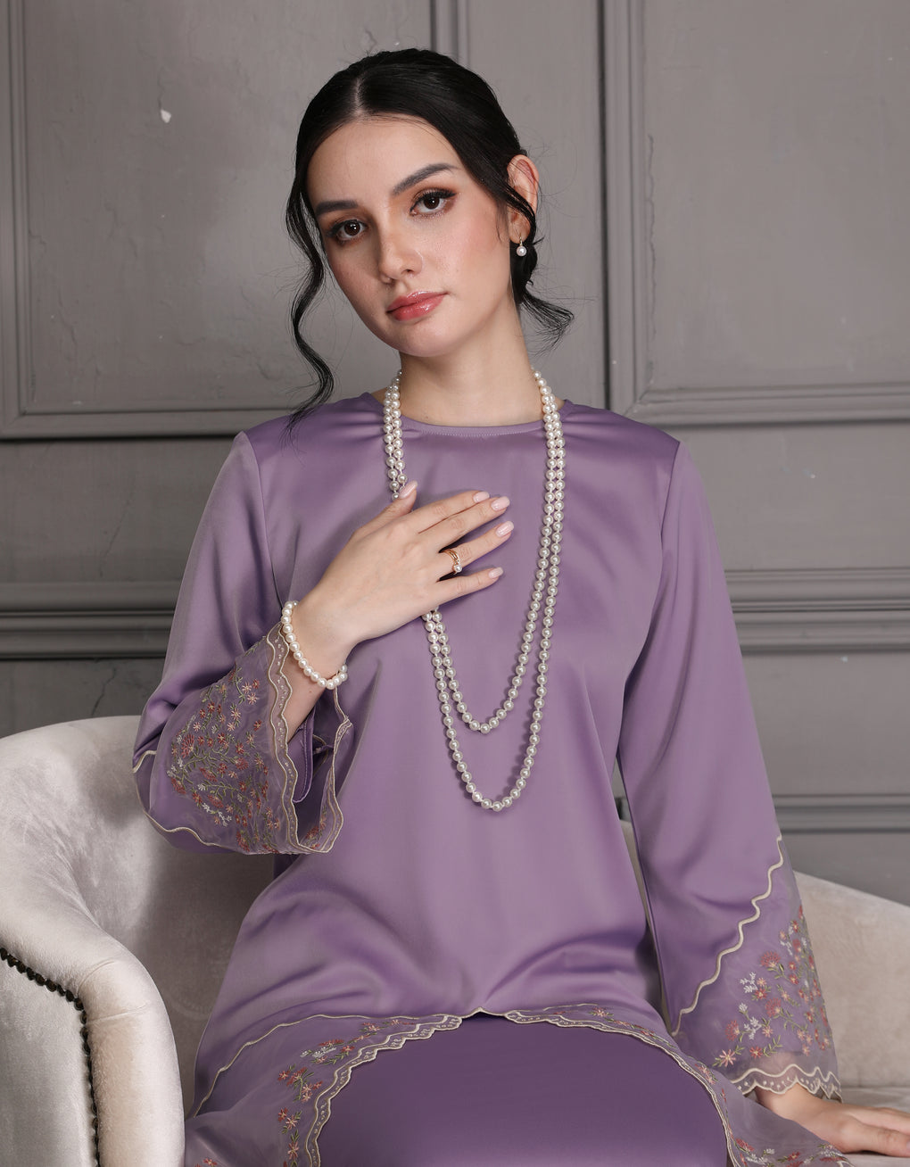 'Baju Kurung Pahang Moden Aurelia' blends tradition with a modern touch. Made from premium Italian Silky Satin, this piece features delicate embroidery on soft organdy that enhances its refined look. It offers both elegance and comfort in a long, flattering silhouette. A timeless choice for formal events or refined everyday wear.