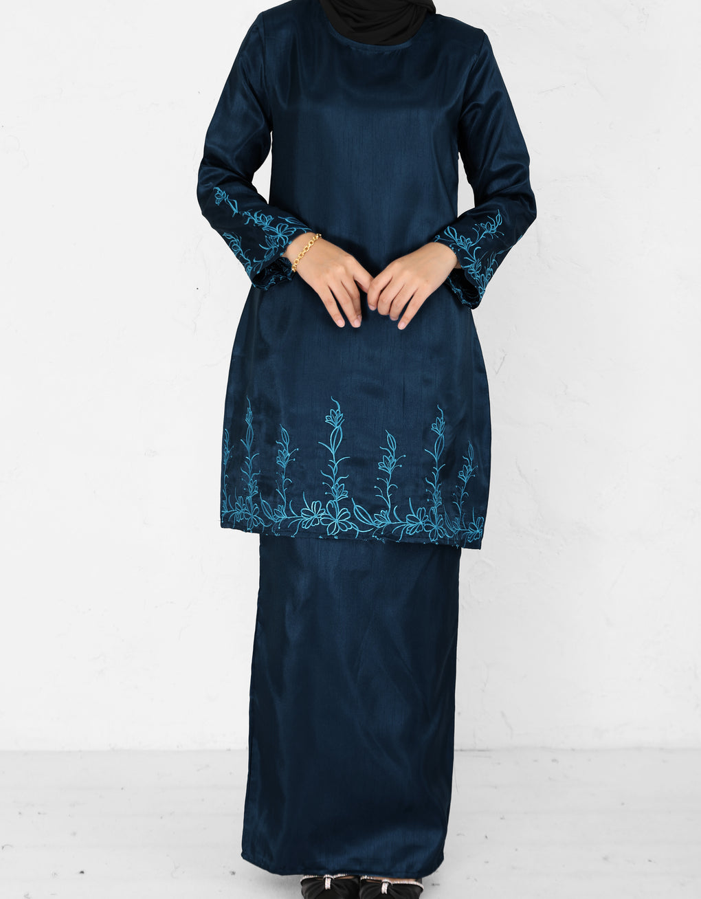 "Baju Kurung Pahang Moden Fianna" made from Shantung Embroidery. This garment features a long, graceful cut that brings out its elegant appeal. It's perfect for formal occasions or stylish everyday wear, making it a timeless piece for anyone who values both cultural heritage and modern fashion.
