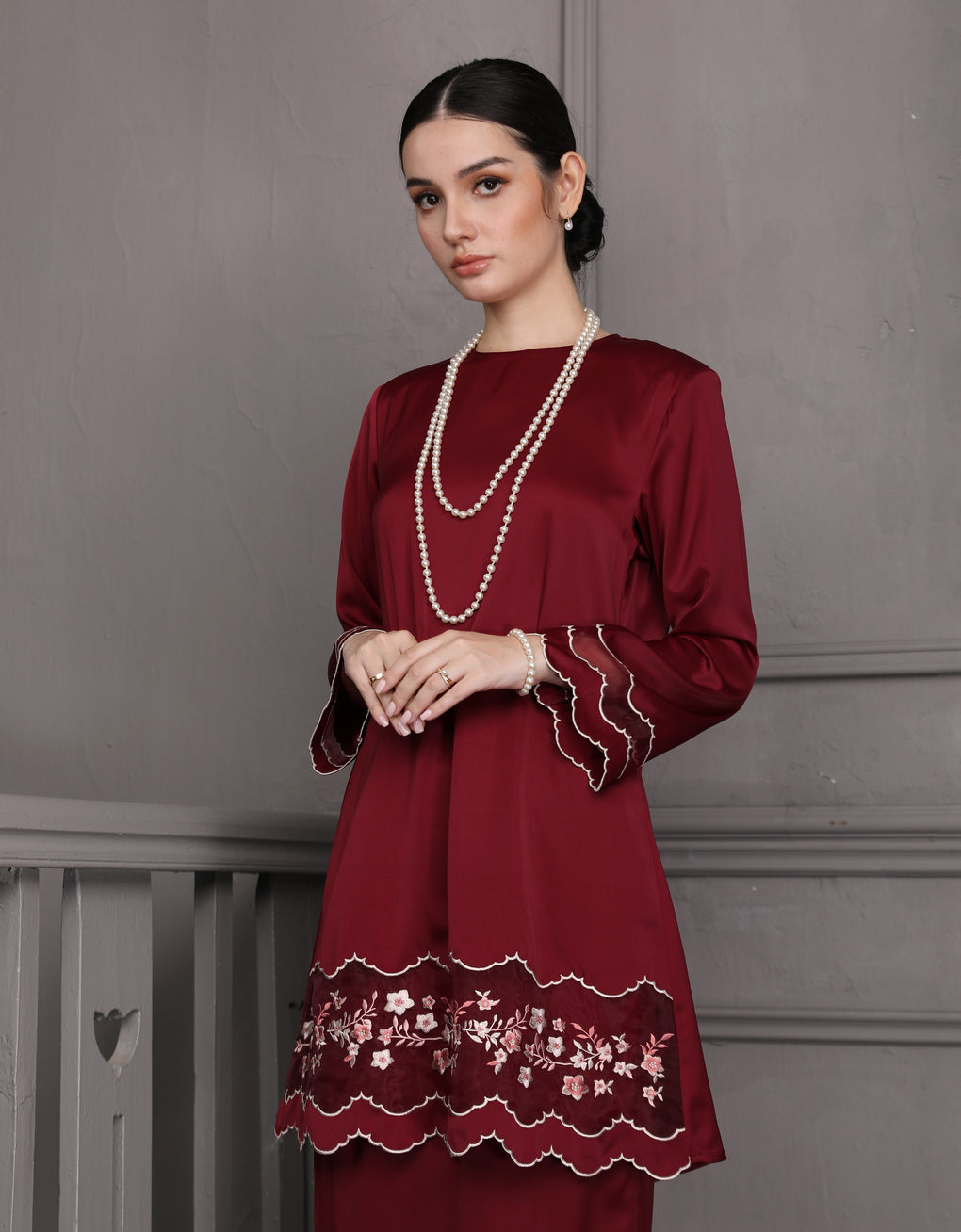 'Baju Kurung Pahang Moden Morana' blends tradition with a modern touch. Made from premium Italian Silky Satin, this piece features delicate embroidery on soft organdy that enhances its refined look. It offers both elegance and comfort in a long, flattering silhouette. A timeless choice for formal events or refined everyday wear.