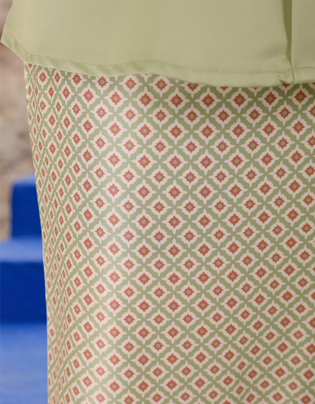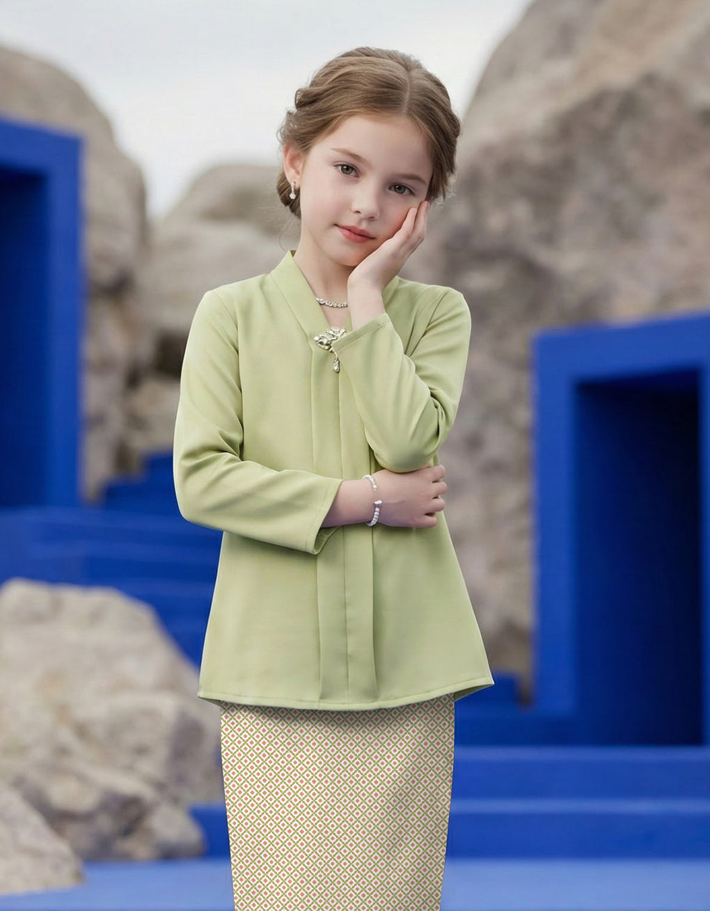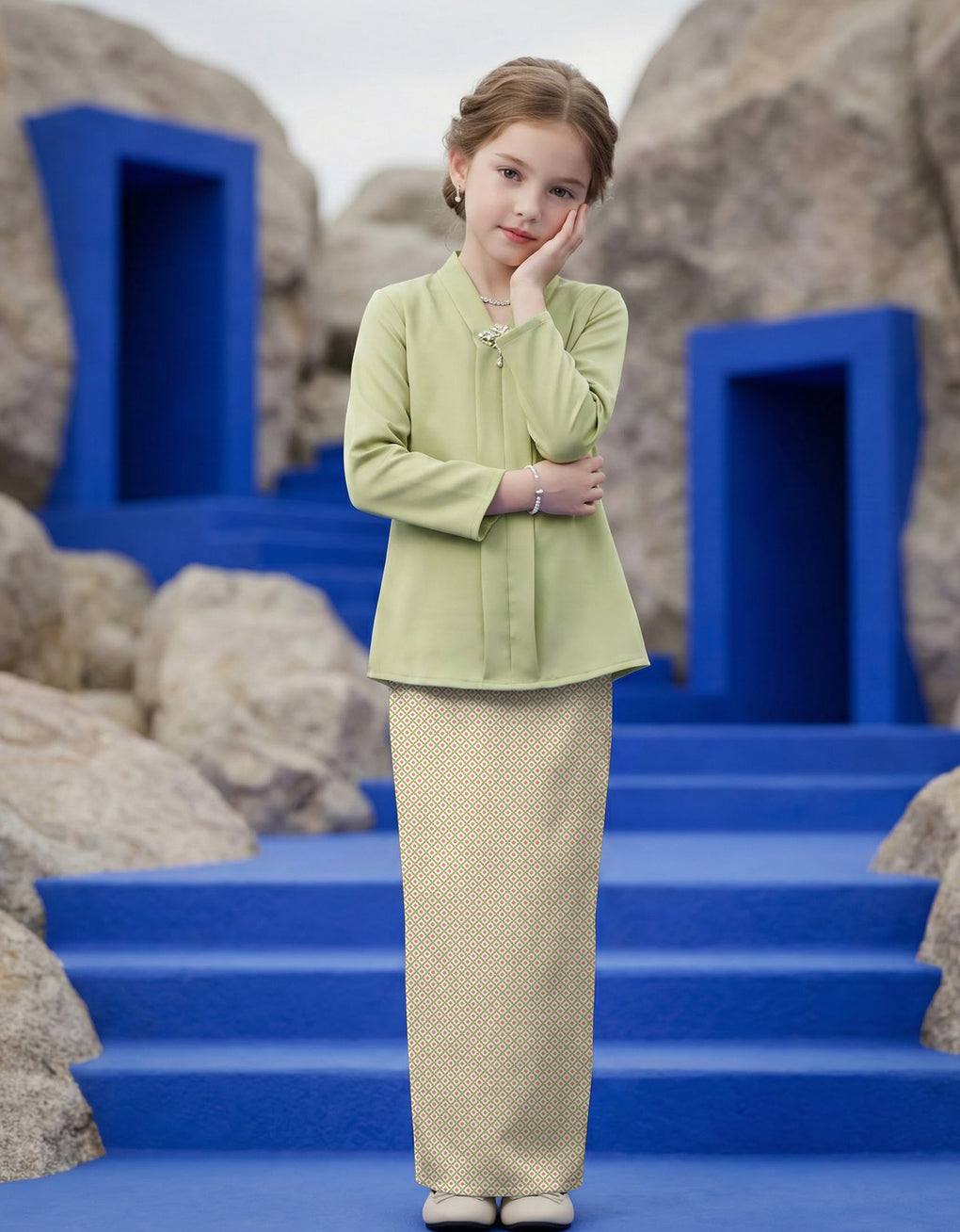 Introduce your daughter to timeless elegance with the Kids Baju Kebaya Melyra features a coordinated plain satin top paired with a beautifully printed satin skirt, designed for the modern family. The soft sage green hue complements all skin tones, while the premium satin fabric drapes gracefully for a polished appearance. Perfect for festive occasions, family portraits, or special celebrations, this mother-daughter ensemble creates a cohesive, sophisticated look. The quality construction ensures comfort throughout the day, making it an investment piece for memorable moments together.