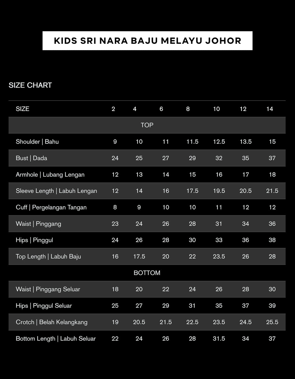 | Bottom Length | Labuh Seluar | 22 | 24 | 26 | 28 | 31.5 | 34 | 37 |