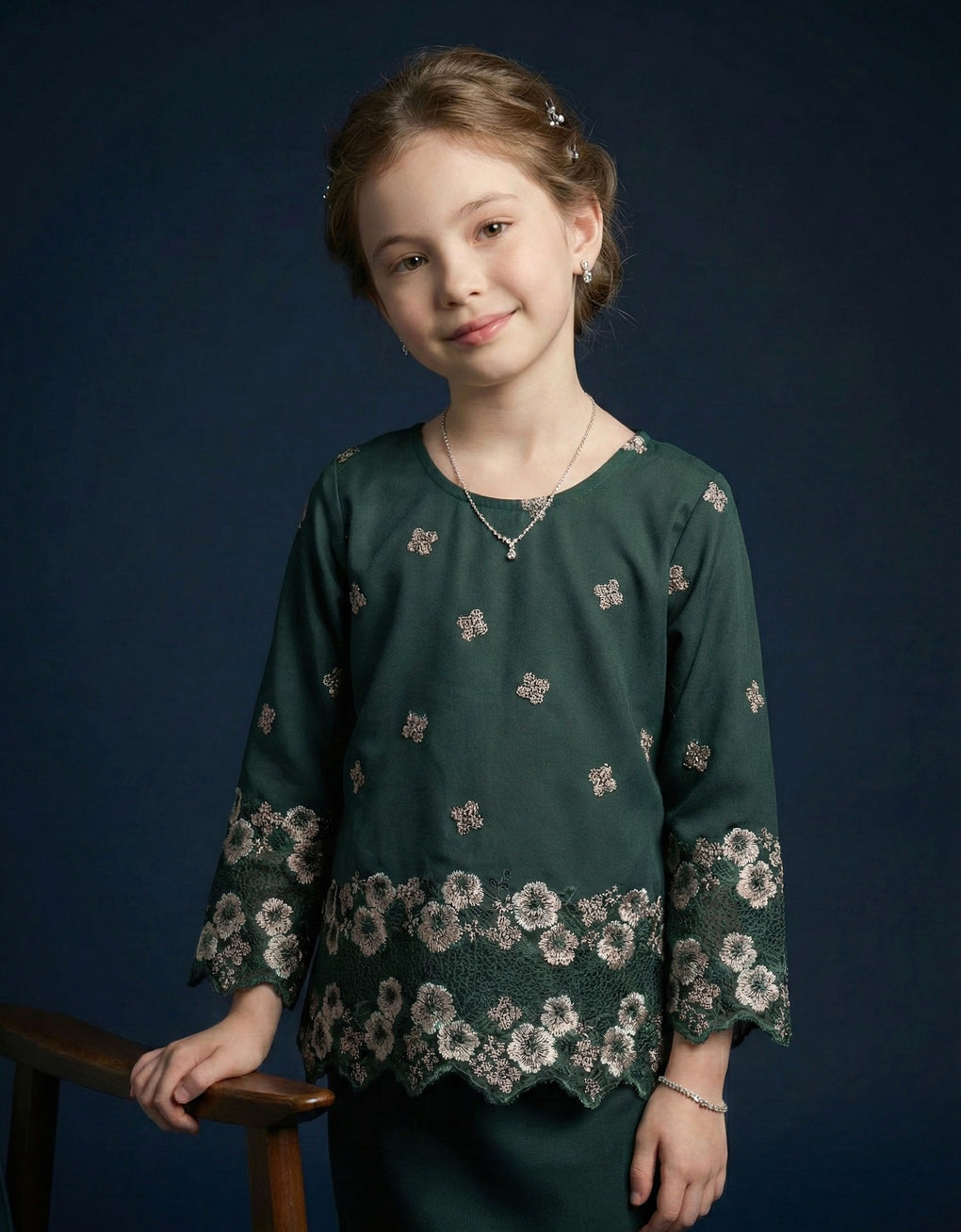 Crafted in a timeless Kedah cut, this piece ensures a comfortable fit for your little one. Delicate Floral Embroidered Lace and a subtly geometric hem create a graceful blend of femininity and elegance perfect for any occasion.