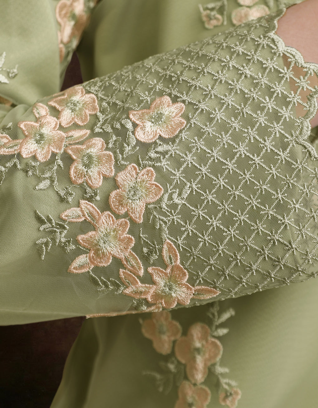 Crafted in a timeless Kedah cut, this piece ensures a comfortable fit for your little one. Delicate Floral Embroidered Lace and a subtly geometric hem create a graceful blend of femininity and elegance perfect for any occasion.