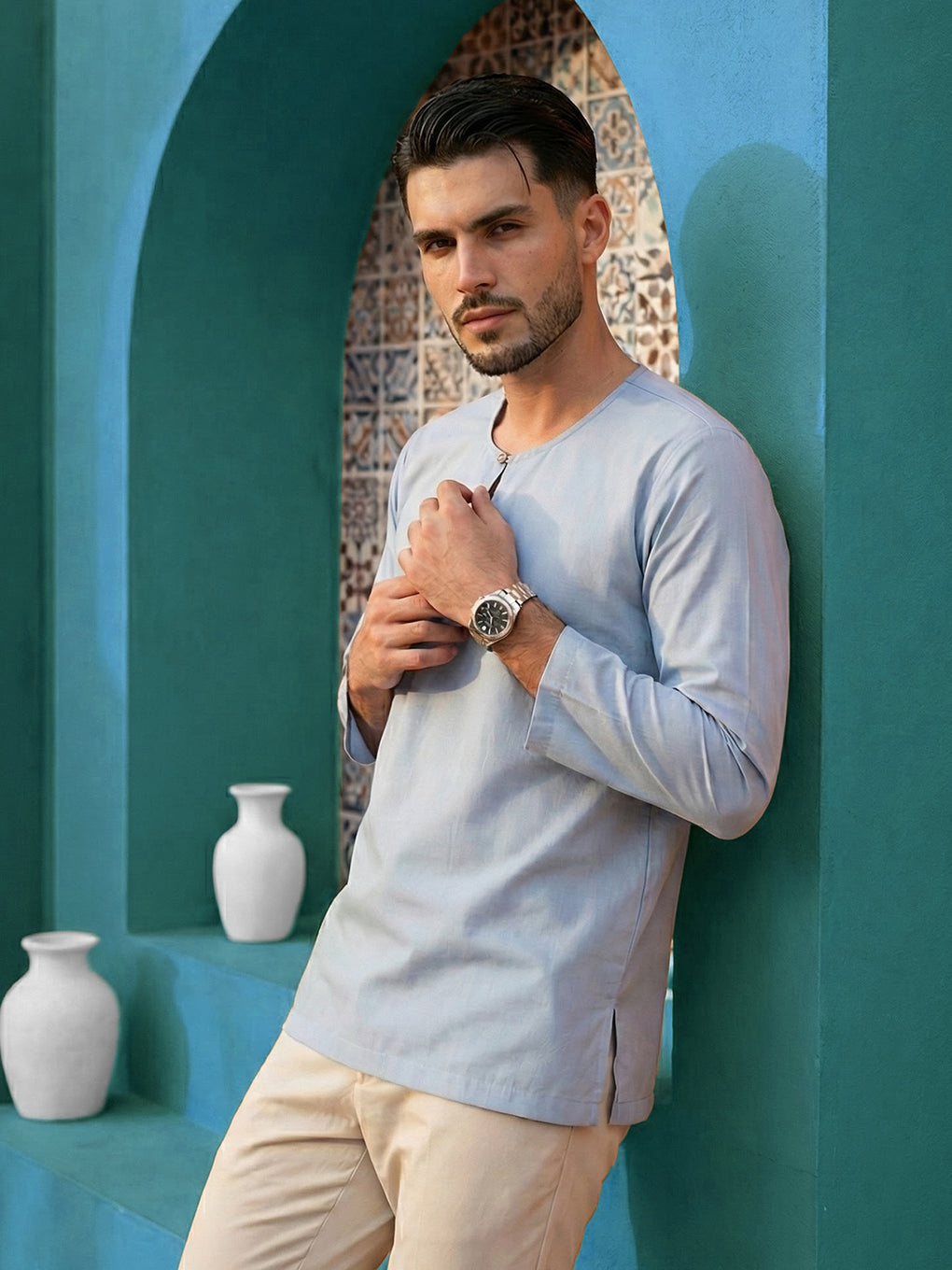Elevate your style with our regular fit round neck kurta. The matched coloured buttons and long sleeves add a touch of sophistication, while the side pockets provides functionality and fashion. Perfect for any occasion, this kurta effortlessly combines comfort and elegance.