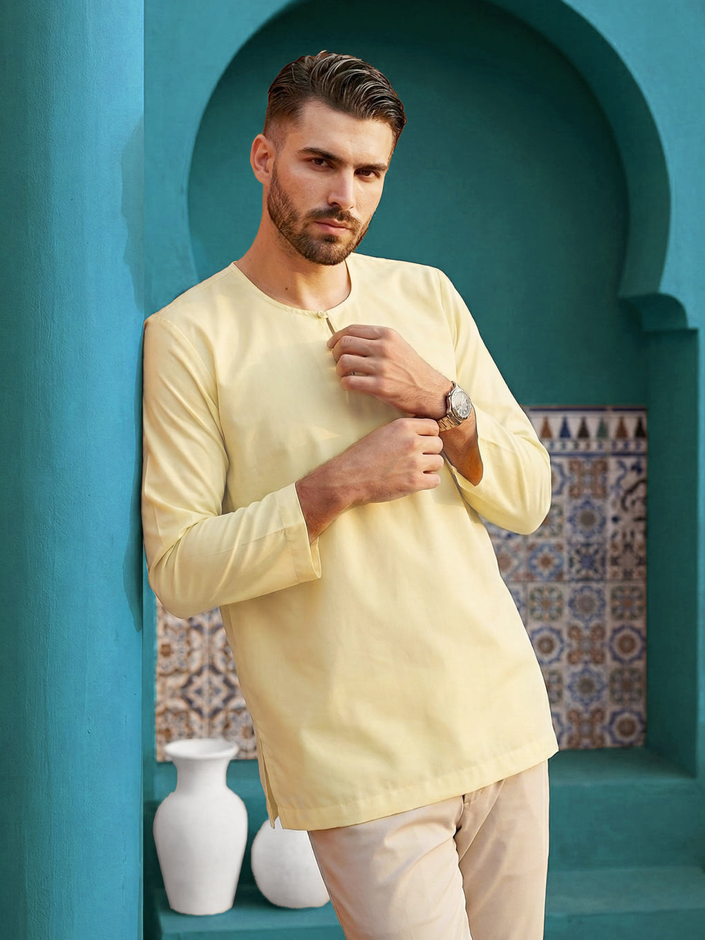 Elevate your style with our regular fit round neck kurta. The matched coloured buttons and long sleeves add a touch of sophistication, while the side pockets provides functionality and fashion. Perfect for any occasion, this kurta effortlessly combines comfort and elegance.